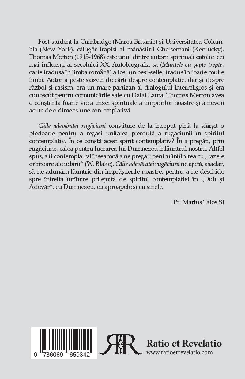 Căile adevăratei rugăciuni constitui de la început până la sfârșit o pledoarie pentru a regăsi unitatea pierdută a rugăciunii în spiritul contemplativ. În ce constă acest spirit contemplativ? În a pregăti, prin rugăciune, calea pentru lucrarea lui Dumnezeu înlăuntrul nostru. Altfel spus, a fi contemplativi înseamnă a ne pregăti pentru întărirarea cu „razele orbitoare ale iubirii” (W. Blake). Căile adevăratei rugăciuni ne ajută, așadar, să ne adunăm lăuntric din împrăștierile noastre, pentru a ne deschide spre întreita întîlnire prilejuită de spiritul contemplației în „Duh și Adevăr”: cu Dumnezeu, cu aproapele și cu sinele. (Pr. Marius Taloș SJ)