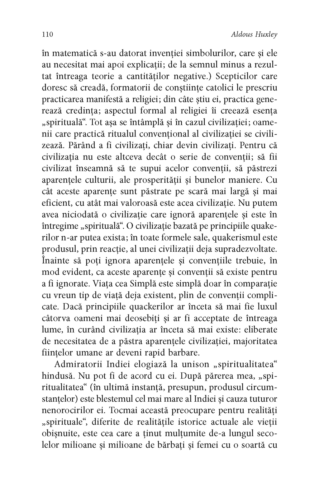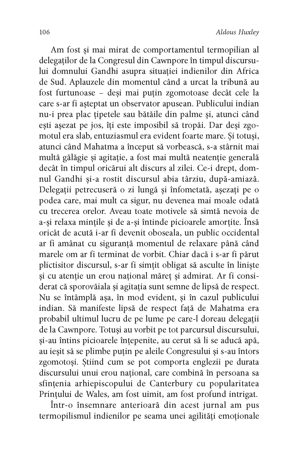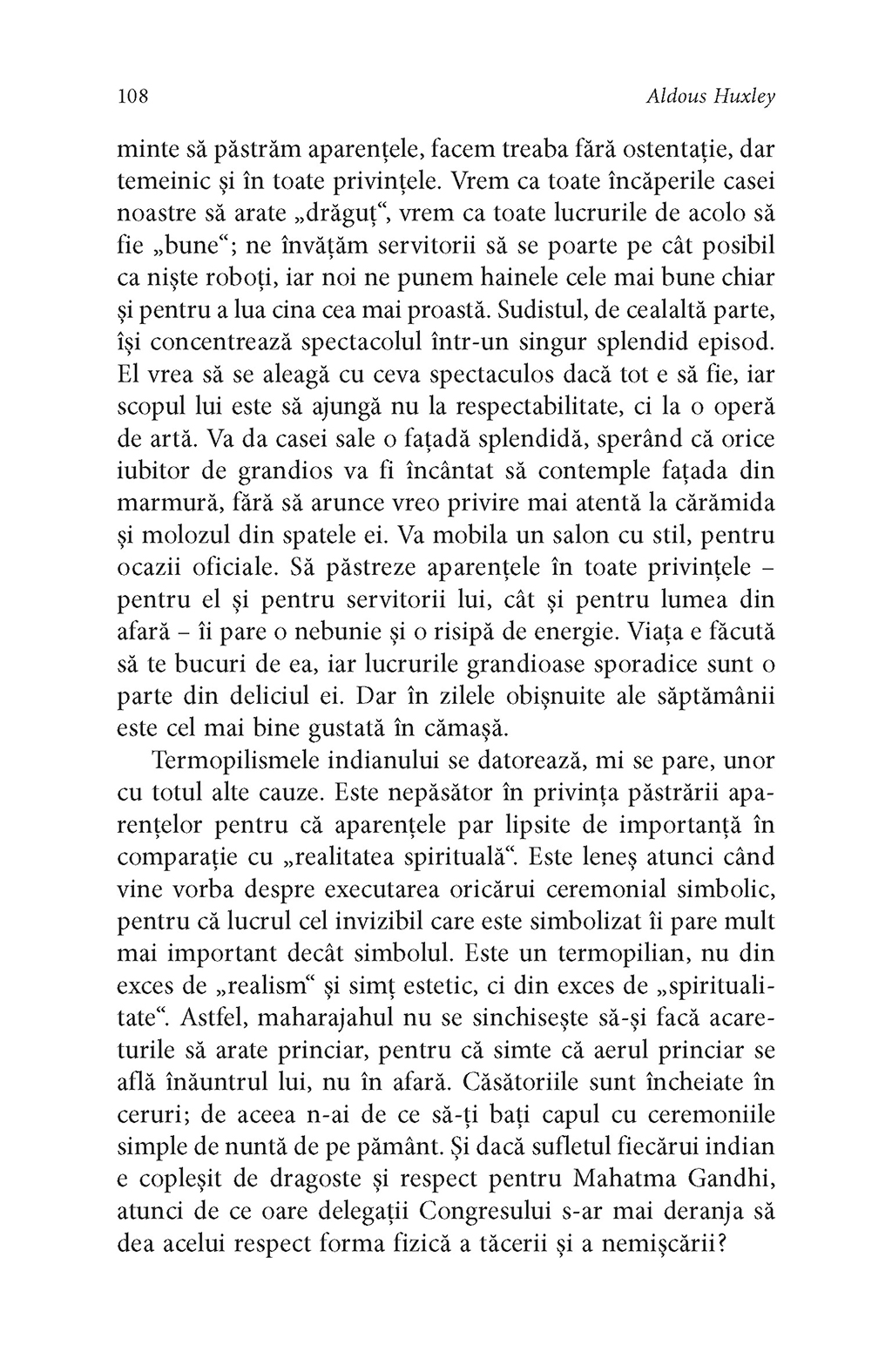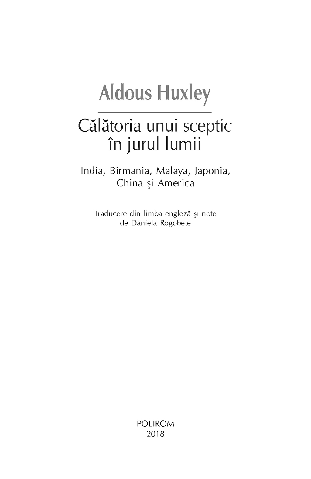 În călătoria sa de un an prin lume (India, Birmania, Japonia, China, America), Aldous Huxley îşi notează impresiile puternice lăsate de locurile pe care le vizitează şi de oamenii pe care îi cunoaşte. India şi Birmania sînt pentru el prilej de a vorbi despre istoria culturală a Caşmirului, despre arhitectura mongolă şi despre istoria artei indiene. Preumblîndu-se cu o ambarcaţiune dinspre tropice spre ecuator, găseşte o veche autobiografie a lui Henry Ford, care-i aminteşte de „valorile şi avantajele” capitalismului. Rezultatul tuturor acestor însemnări este un jurnal încîntător şi plin de viaţă, care dezvăluie un Huxley rafinat, plin de umor şi de profunzime: „Am pornit în călătorie ştiind, sau crezînd că ştiu, cum ar trebui să trăiască oamenii, cum ar trebui să fie guvernaţi, educaţi, ce ar trebui să creadă. Ştiam care e cea mai bună formă de organizare socială şi scopul pentru care au fost create societăţile. Aveam părerile mele asupra oricărei activităţi a vieţii umane. Acum, la întoarcere, mă trezesc lipsit de toate aceste certitudini plăcute”.
