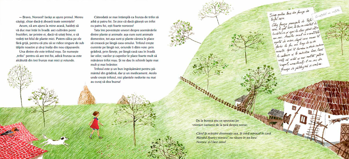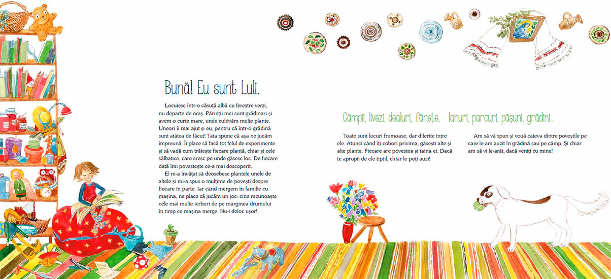 Colindând câmpii, fâneţe, lanuri, păşuni şi grădini, Luli şi Norocel, căţelul său jucăuș, îţi vor împărtăşi din tainele plantelor şi florilor. Vei afla lucruri interesante despre cântece, jocuri sau obiceiuri lăsate de bunici și străbunici.