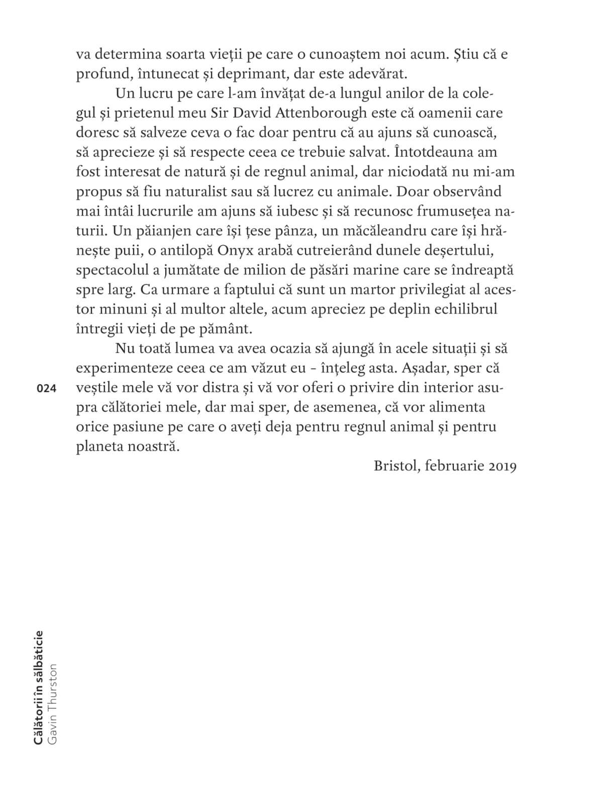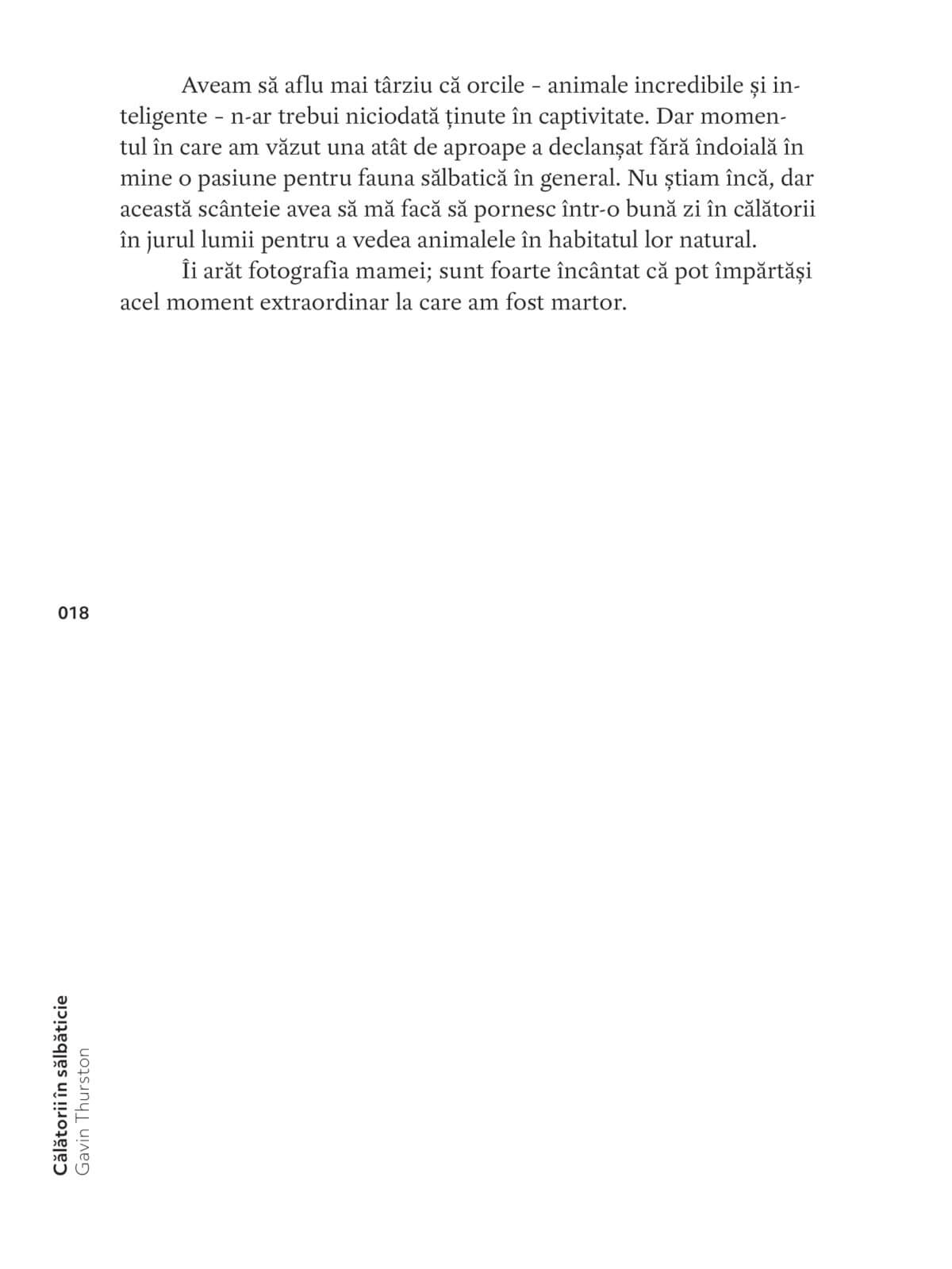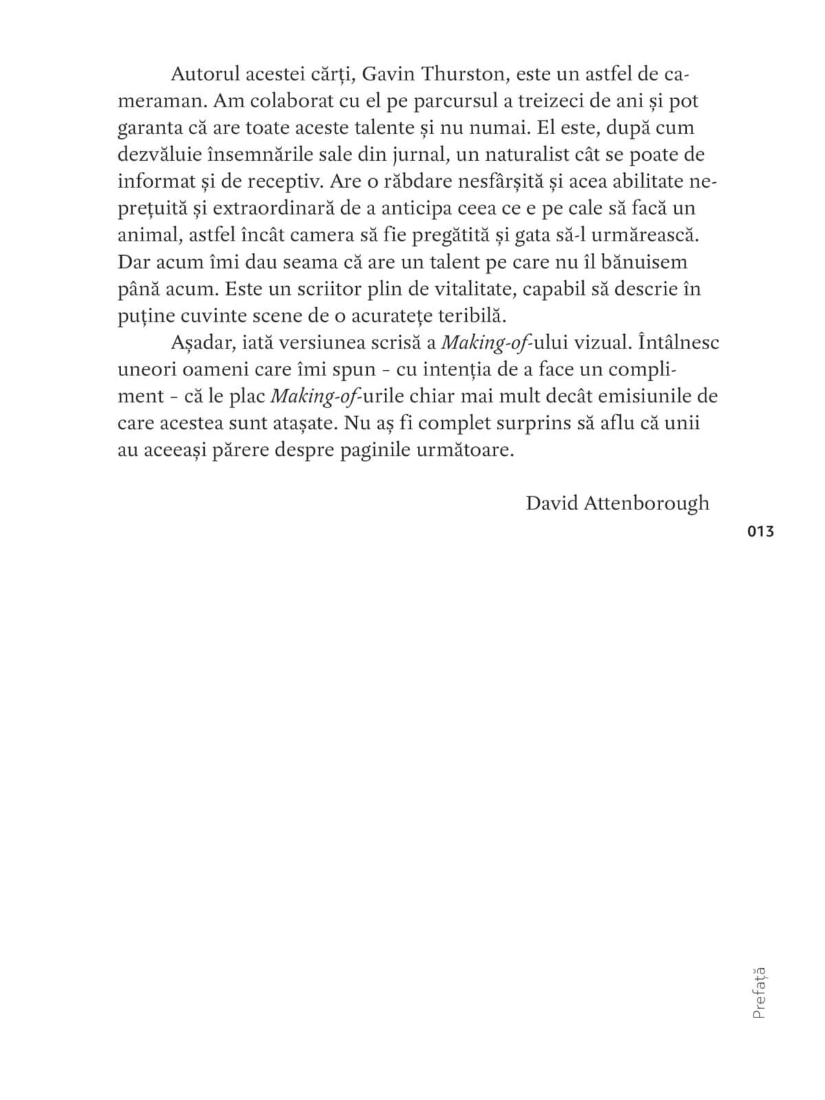 O poveste a regăsirii omului cu natura. Gavin ne poartă în acea zonă aproape intangibilă în care, după ore întregi de veghe, adormi și te trezești exact când animalul pe care îl urmăreai vine să-și hrănească puiul. Și, dincolo de teama întâlnirii cu ceea ce am uitat de mult, ne amintim, din negurile înregistrărilor noastre ADN, de un timp când totul era interconectat, că, de fapt, nimic nu s-a schimbat, ci doar noi am uitat. Noi, oamenii. -- Andreea Ionescu, coach integrativ