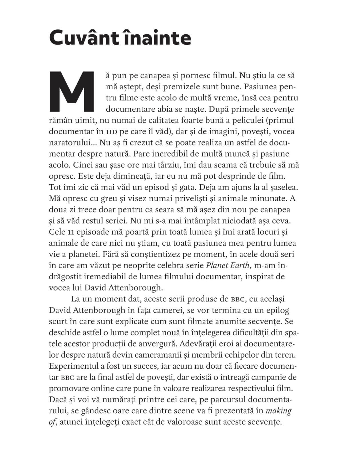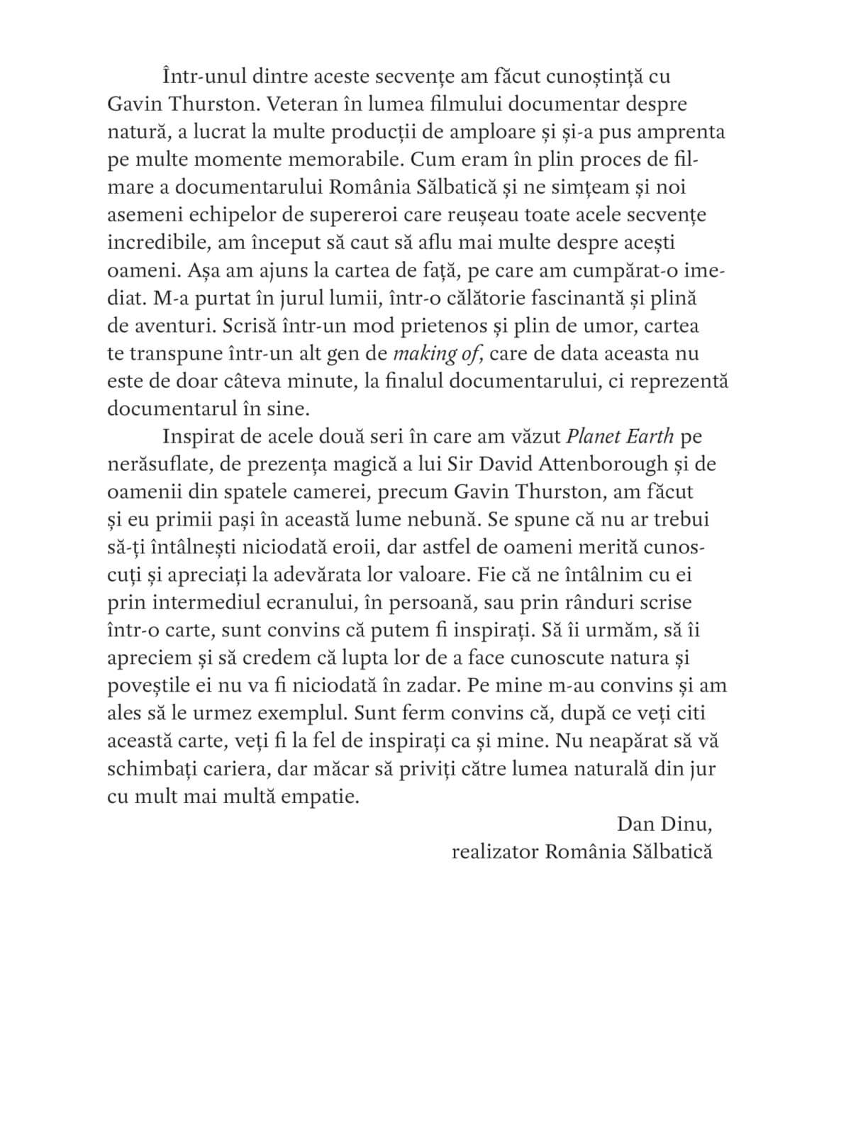După ce veți citi această carte, veți fi la fel de inspirați ca și mine; nu neapărat să vă schimbați cariera, dar măcar să priviți către lumea naturală din jur cu mult mai multă empatie. -- Dan Dinu, realizator România Sălbatică