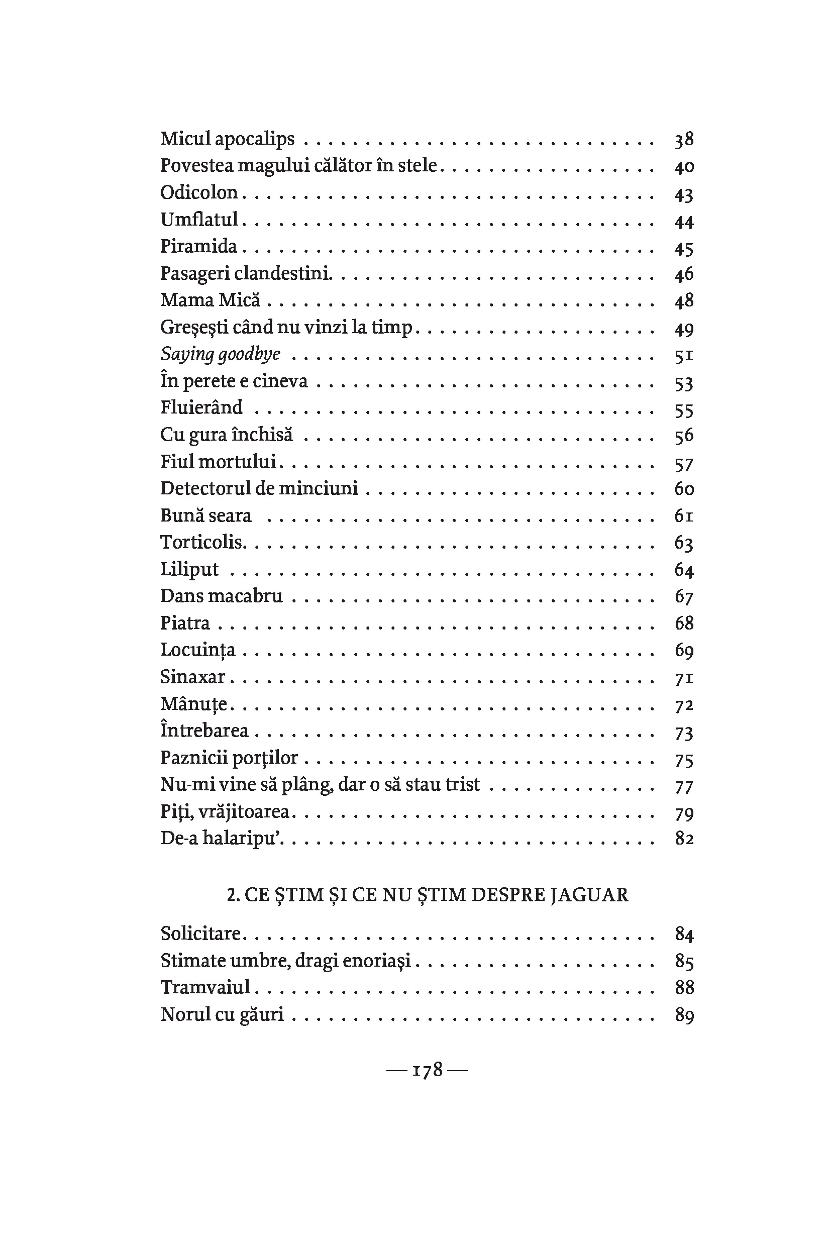 Îi știu după nume și după porecle. Jim, Harcor și Guguloi. Mie îmi ziceau Rânjita, pe scurt Rânji, că-mi plăcea să mă hlizesc și să râd cu gura pân’ la urechi. Râdeam din orice. Râdeam și de ei, că aveai de ce să râzi. Pe supermașina aia, un Jaguar prăpădit, care mergea, da’ nu mergea decât stând pe loc, și-au dat toate economiile. Vai de economiile lor! A costat, dacă-mi amintesc bine, două sute de dolari. Nici la fier vechi nu mai luau pe ea atâta. Însă era bolidul lor. Jaguarul lor. Adică animal de pradă. Vedeți dumneavoastră, n-ar fi cumpărat un Mercedes sau altceva, că nu li se umflau mușchii decât când ziceau:
