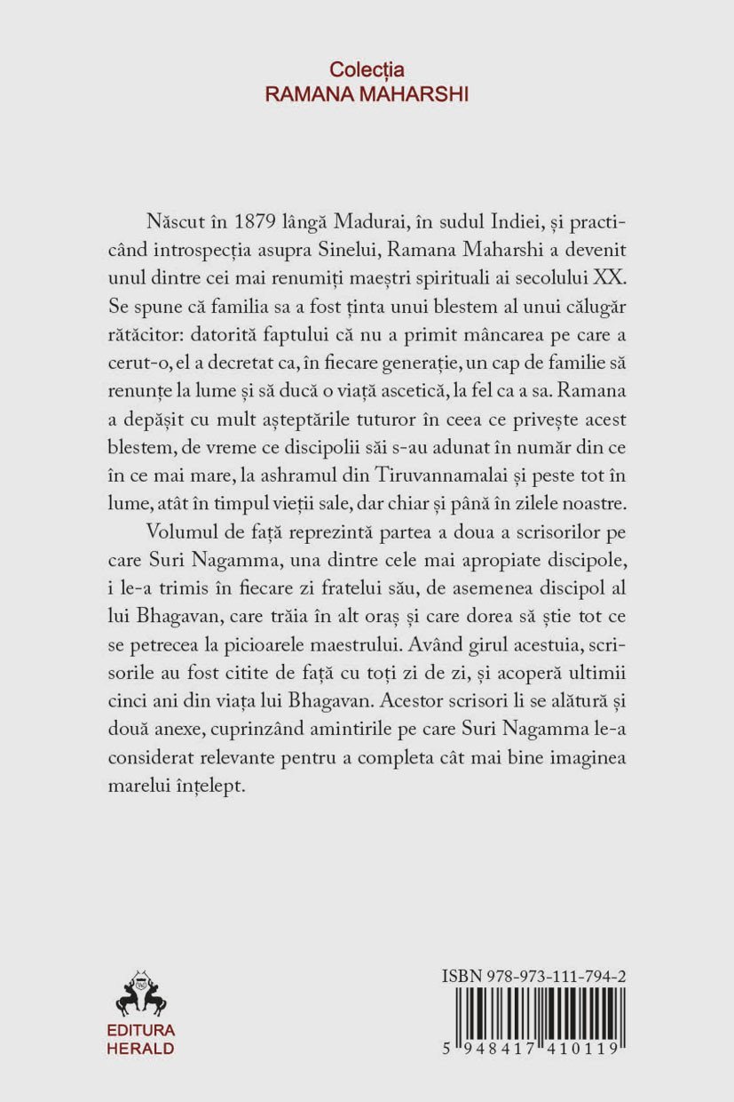 Volumul de fata reprezinta partea a doua a scrisorilor pe care Suri Nagamma, una dintre cele mai apropiate discipole, i le-a trimis in fiecare zi fratelui sau, de asemenea discipol al lui Bhagavan, care traia in alt oras si care dorea sa stie tot ce