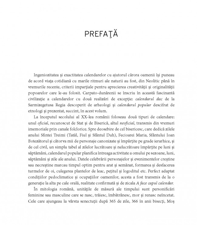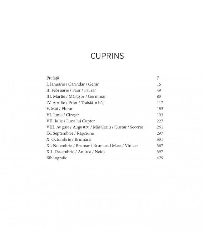 Lunile anului aniversar al centenarului Marii Uniri 2018 devin în acest volum capitole cu 366 de subcapitole în care sunt prezentate sărbătorile şi obiceiurile calendaristice înregistrate din provinciile istorice unite la 1 decembrie 1918. În perioada Unirii, ţăranul folosea două tipuri de calendare: unul oficial, recunoscut de stat şi de biserică, şi altul neoficial, transmis exclusiv pe cale orală. Spre deosebire de Calendarul bisericesc, care dedică zilele anului Sfintei Treimi (Tatăl, Fiul şi Sfântul Duh), Fecioarei Maria, Sfântului Ioan Botezătorul şi câtorva mii de personaje canonizate, Calendarul popular îi indica în plus săteanului semnificaţiile materiale sau spirituale ale zilelor sărbătorite: la Nunta urzicilor (Duminica Floriilor) înfloreşte urzica şi nu mai era folosită în alimentaţie; Împuiatul urşilor (1 august, Scoaterea Sf, Cruci) anunţă perioada de împerechere a urşilor; Nunta oilor (14 octombrie, Sf. Cuv. Parascheva) se amestecă berbecii cu oile pentru împerechere; la Ziua cucului (25 martie, Buna Vestire), acesta începe a cânta vestind ziua egală cu noaptea etc. Fiecare zi a anului oferă cititorului o frumoasă tradiţie românească.