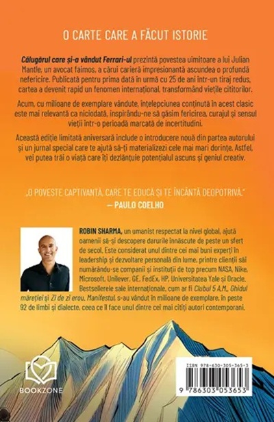 Călugărul care și-a vândut Ferrari-ul prezintă povestea uimitoare a lui Julian Mantle, un avocat faimos, a cărui carieră impresionantă ascundea o profundă nefericire. Publicată pentru prima dată în urmă cu 25 de ani într-un tiraj redus, cartea a devenit rapid un fenomen transformator pentru cititori, răspândindu-se în întreaga lume.