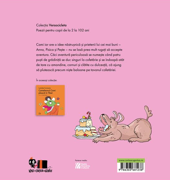 Căci aventura periculoasă se numește când patru puști de grădiniță se duc singuri la cofetărie și se îndoapă atât de tare cu amandine, cornuri și clătite cu dulceață, că ajung să plutească precum niște baloane pe tavanul cofetăriei.