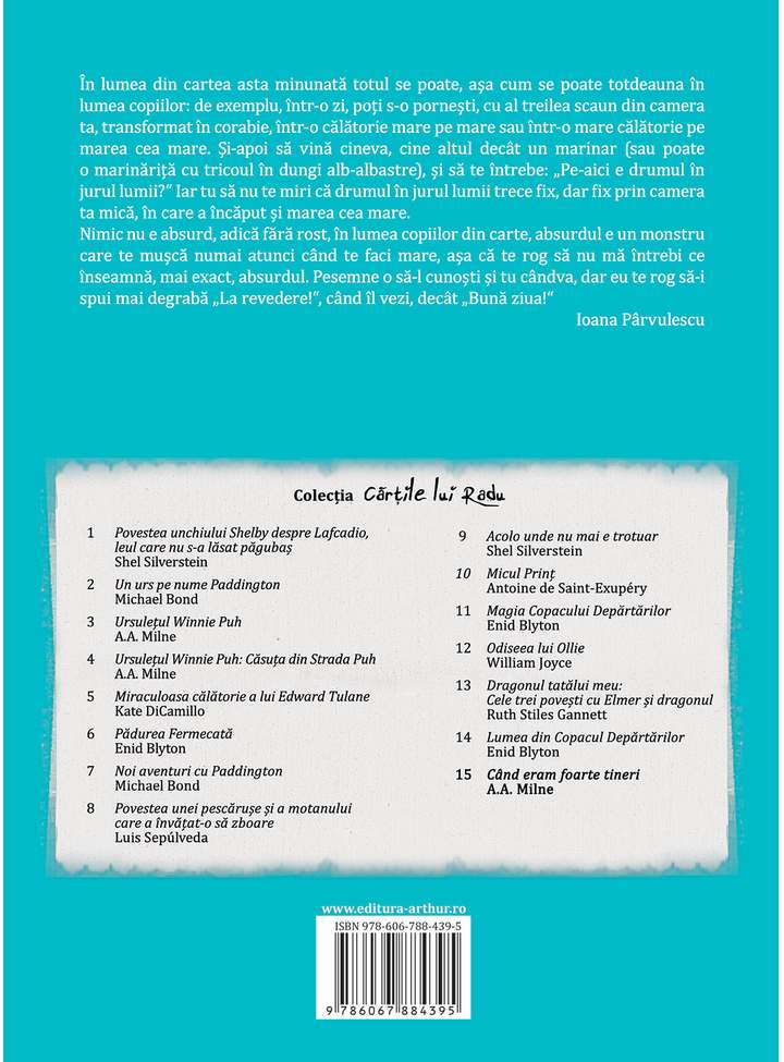În lumea din cartea asta minunată totul se poate, așa cum se poate totdeauna în lumea copiilor: de exemplu, într-o zi, poți s-o pornești, cu al treilea scaun din camera ta, transformat în corabie, într-o călătorie mare pe mare sau o mare călătorie pe marea cea mare. Și-apoi să vină cineva, cine altul decât un marinar (sau poate o marinăriță cu tricoul în dungi alb-albastre) și să te întrebe: „Pe-aici e drumul în jurul lumii?” Iar tu să nu te miri că drumul în jurul lumii trece fix, dar fix prin camera ta mică, în care a încăput și marea cea mare.
