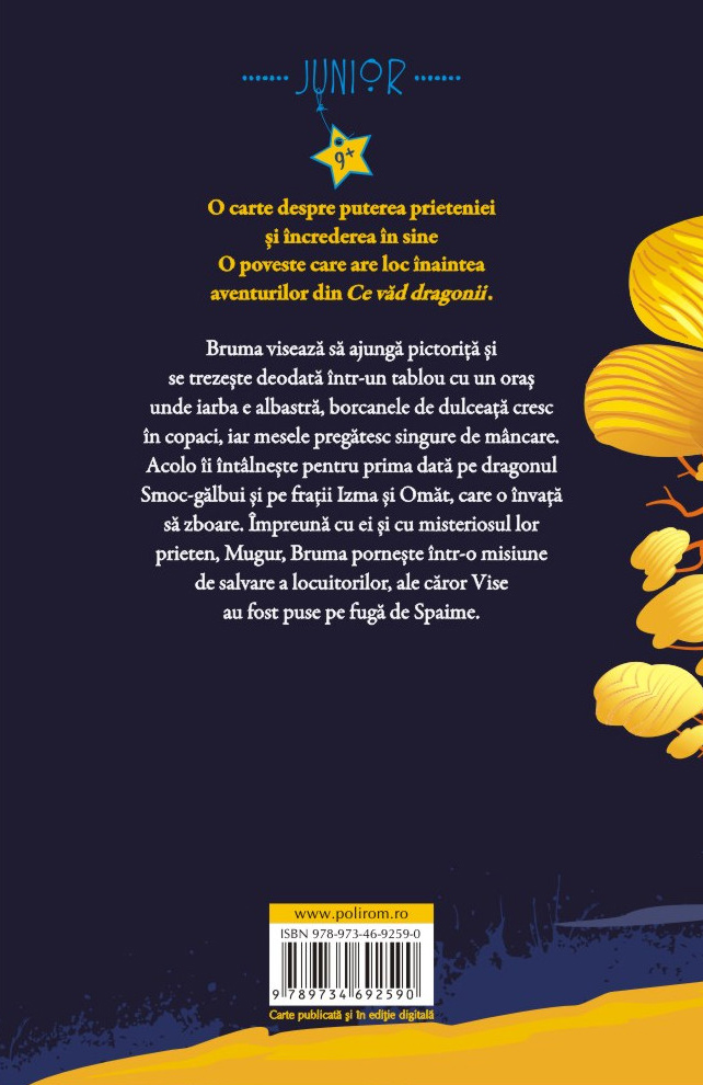Bruma visează să ajungă pictoriţă și se trezește deodată într-un tablou cu un oraș unde iarba e albastră, borcanele de dulceaţă cresc în copaci, iar mesele pregătesc singure de mâncare. Acolo îi întâlnește pentru prima dată pe dragonul Smoc-gălbui și pe fraţii Izma și Omăt, care o învaţă să zboare. Împreună cu ei și cu misteriosul lor prieten, Mugur, Bruma pornește într-o misiune de salvare a locuitorilor, ale căror Vise au fost puse pe fugă de Spaime.