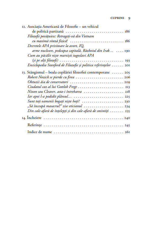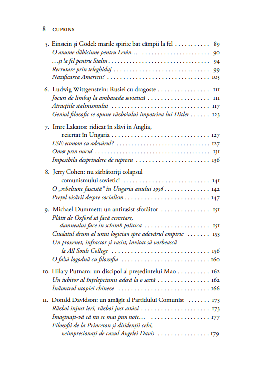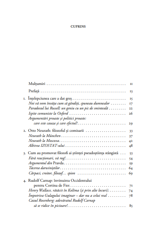 După o tinereţe frământată petrecută la Zagreb, unde, ca asistent de filozofie, a intrat în conflict deschis cu exponenţii marxismului oficial al vremii, Neven Sesardić a colindat câteva universităţi occidentale, ca bursier mai întâi, apoi ca profesor şi profesor asociat. Spirit perspicace şi combativ, el a constatat că şi aici, în cetăţile occidentale ale raţiunii, aceasta din urmă nu e în toate împrejurările regină, mai exact că filozofii înşişi pot fi orbiţi de patimi politice. Şi, la fel ca în tinereţe, Sesardić a ales să nu tacă, trecând în revistă cele mai răsunătoare cazuri de alunecare spre extrema stângă din rândul universitarilor americani de ieri şi de azi. Între numele de prim rang reţinute de analiza filozofului croat se numără Bertrand Russell, Otto Neurath, Rudolf Carnap, Albert Einstein, Kurt Gödel, Ludwig Wittgenstein, Imre Lakatos, Michael Dummett, Hilary Putnam sau Robert Nozick.