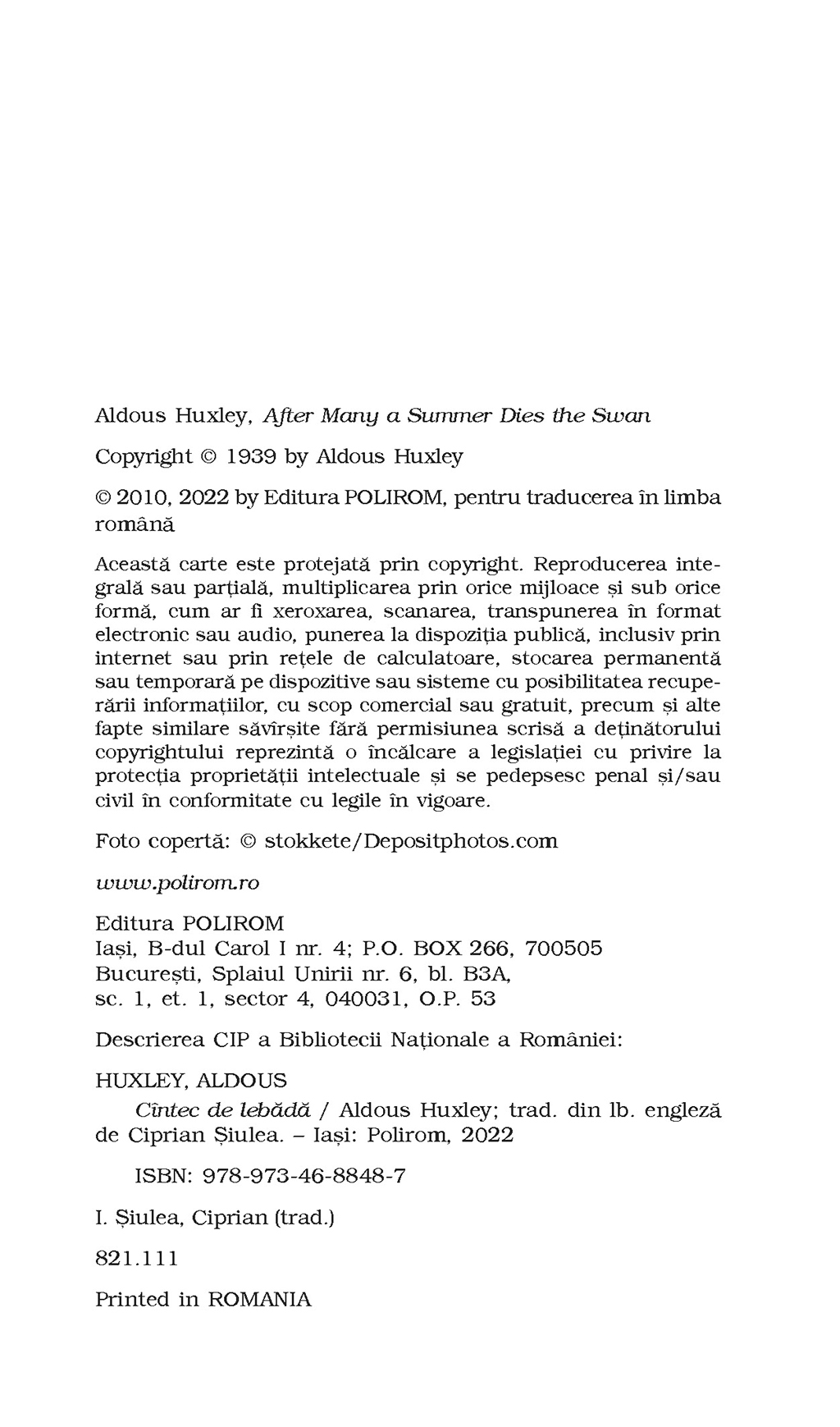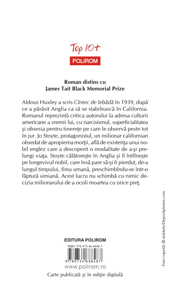 Aldous Huxley a scris Cântec de lebădă în 1939, după ce a părăsit Anglia ca să se stabilească în California. Romanul reprezintă critica autorului la adresa culturii americane a vremii lui, cu narcisismul, superficialitatea şi obsesia pentru tinereţe pe care le observă peste tot în jur. Jo Stoyte, protagonistul, un milionar californian obsedat de apropierea morţii, află de existenţa unui nobil englez care a descoperit o modalitate de a-şi prelungi viaţa. Stoyte călătoreşte în Anglia şi îl întâlneşte pe longevivul nobil, care însă pare să-şi fi pierdut, de-a lungul timpului, firea umană, preschimbându-se într-o făptură simiană. Acest lucru nu schimbă cu nimic de-cizia milionarului de a ocoli moartea cu orice preţ.