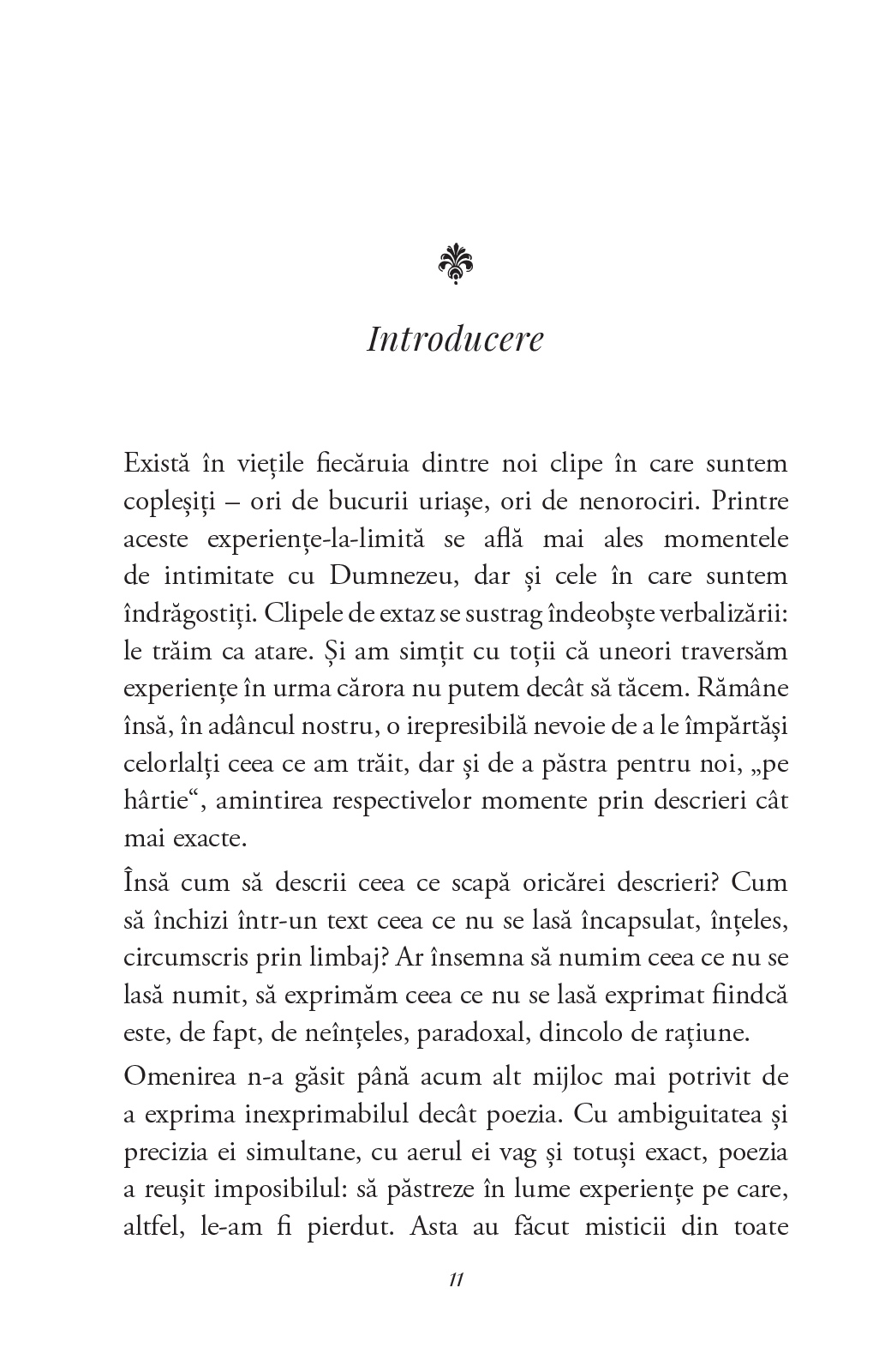 Există în viețile fiecăruia dintre noi clipe în care suntem copleșiți – ori de bucurii uriașe, ori de nenorociri. Printre aceste experiențe-la-limită se află mai ales momentele de intimitate cu Dumnezeu, dar și cele în care suntem îndrăgostiți. Clipele de extaz se sustrag îndeobște verbalizării: le trăim ca atare. Și am simțit cu toții că traversăm uneori experiențe în urma cărora nu putem decât să tăcem. Rămâne însă, în adâncul nostru, o irepresibilă nevoie de a le împărtăși celorlalți ceea ce am trăit, dar și de a păstra pentru noi, „pe hârtie”, amintirea respectivelor momente prin descrieri cât mai exacte.