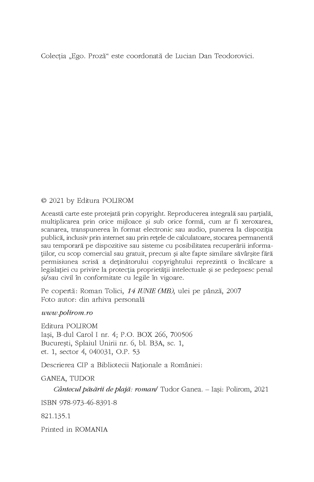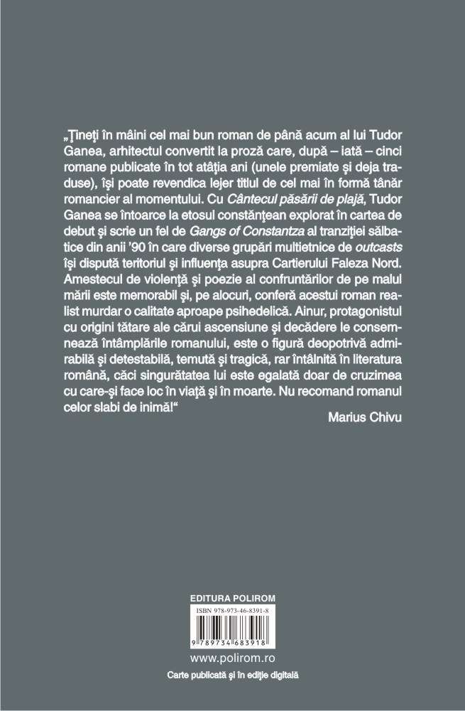 „Țineți în mîini cel mai bun roman de pînă acum al lui Tudor Ganea, arhitectul convertit la proză care, după – iată – cinci romane publicate în tot atîția ani (unele premiate și deja traduse), își poate revendica lejer titlul de cel mai în formă tînăr romancier al momentului. Cu Cîntecul păsării de plajă, Tudor Ganea se întoarce la etosul constănțean explorat în cartea de debut și scrie un fel de Gangs of Constantza al tranziției sălbatice din anii ’90 în care diverse grupări multietnice de outcasts își dispută teritoriul și influența asupra Cartierului Faleza Nord. Amestecul de violență și poezie al confruntărilor de pe malul mării este memorabil și, pe alocuri, conferă acestui roman realist murdar o calitate aproape psihedelică. Ainur, protagonistul cu origini tătare ale cărui ascensiune și decădere le consemnează întîmplările romanului, este o figură deopotrivă admirabilă și detestabilă, temută și tragică, rar întîlnită în literatura română, căci singurătatea lui este egalată doar de cruzimea cu care-și face loc în viață și în moarte. Nu recomand romanul celor slabi de inimă!” (Marius Chivu)