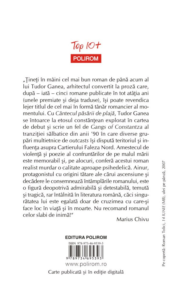 „Ţineţi în mâini cel mai bun roman de până acum al lui Tudor Ganea, arhitectul convertit la proză care, după – iată – cinci romane publicate în tot atâţia ani (unele premiate şi deja traduse), îşi poate revendica lejer titlul de cel mai în formă tânăr romancier al momentului. Cu Cântecul păsării de plajă, Tudor Ganea se întoarce la etosul constănţean explorat în cartea de debut şi scrie un fel de Gangs of Constantza al tranziţiei sălbatice din anii ’90 în care diverse grupări multietnice de outcasts îşi dispută teritoriul şi influenţa asupra Cartierului Faleza Nord. Amestecul de violenţă şi poezie al confruntărilor de pe malul mării este memorabil şi, pe alocuri, conferă acestui roman realist murdar o calitate aproape psihedelică. Ainur, protagonistul cu origini tătare ale cărui ascensiune şi decădere le consemnează întâmplările romanului, este o figură deopotrivă admirabilă şi detestabilă, temută şi tragică, rar întâlnită în literatura română, căci singurătatea lui este egalată doar de cruzimea cu care-şi face loc în viaţă şi în moarte. Nu recomand romanul celor slabi de inimă!” (Marius Chivu)