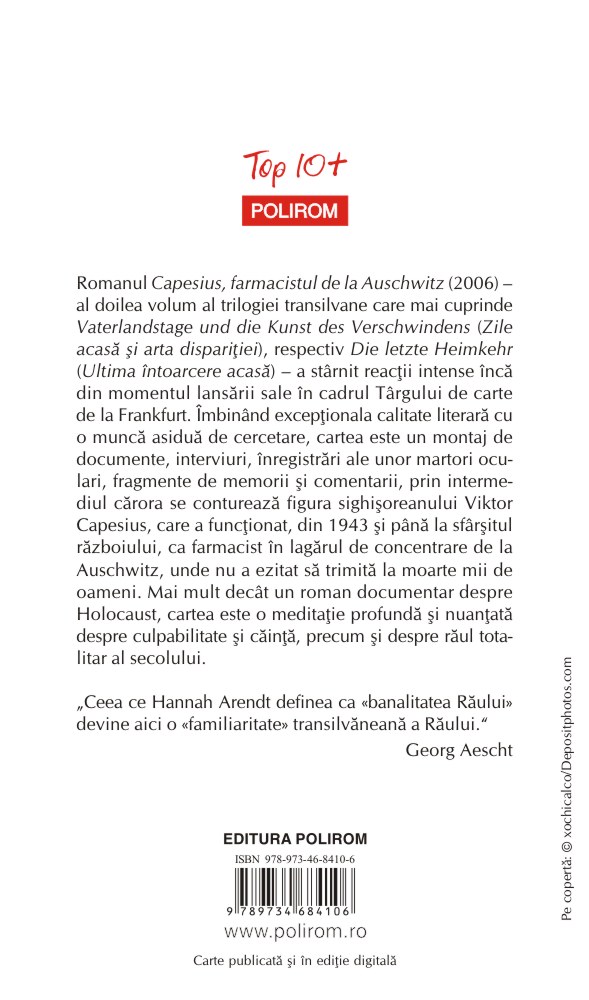 Romanul Capesius, farmacistul de la Auschwitz (2006) – al doilea volum al trilogiei transilvane care mai cuprinde Vaterlandstage und die Kunst des Verschwindens (Zile acasă şi arta dispariţiei), respectiv Die letzte Heimkehr (Ultima întoarcere acasă) – a stîrnit reacţii intense încă din momentul lansării sale în cadrul Tîrgului de carte de la Frankfurt. Îmbinînd excepţionala calitate literară cu o muncă asiduă de cercetare, cartea este un montaj de documente, interviuri, înregistrări ale unor martori oculari, fragmente de memorii şi comentarii, prin intermediul cărora se conturează figura sighişoreanului Viktor Capesius, care a funcţionat, din 1943 şi pînă la sfîrşitul războiului, ca farmacist în lagărul de concentrare de la Auschwitz, unde nu a ezitat să trimită la moarte mii de oameni. Mai mult decît un roman documentar despre Holocaust, cartea este o meditaţie profundă şi nuanţată despre culpabilitate şi căinţă, precum şi despre răul totalitar al secolului.