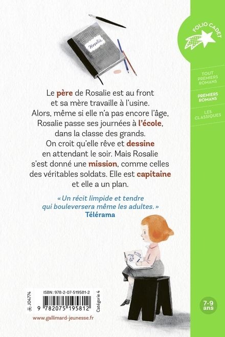 Le père de Rosalie est au front et sa mère travaille à l'usine. Alors, même si elle n'a pas encore l'âge, Rosalie passe ses journées à l'école, dans la classe des grands. On croit qu'elle rêve et dessine en attendant le soir. Mais Rosalie s'est donné une mission, comme celles des véritables soldats. Elle est capitaine et elle a un plan.
