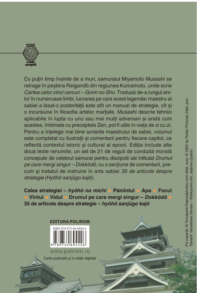 Cu puțin timp înainte de a muri, samuraiul Miyamoto Musashi se retrage în peștera Reigandō din regiunea Kumamoto, unde scrie Cartea celor cinci cercuri – Gorin no Sho. Tradusă de-a lungul anilor în numeroase limbi, lucrarea pe care acest legendar maestru al sabiei a lăsat-o posterității este atât un manual de strategie, cât și o incursiune în filosofia artelor marțiale. Musashi descrie tehnici aplicabile în lupta cu unu sau mai mulți adversari și arată cum acestea, îmbinate cu preceptele Zen, pot fi utile în viața de zi cu zi. Pentru a înțelege mai bine scrierile maestrului de sabie, volumul este completat cu ilustrații și comentarii pentru fiecare capitol, ce reflectă contextul istoric și cultural al epocii. Ediția include alte două texte renumite, un set de 21 de reguli de conduită morală concepute de celebrul samurai pentru discipolii săi intitulat Drumul pe care mergi singur – Dokkōdō, cu o secțiune de comentarii, precum și tratatul de instruire în arta sabiei 35 de articole despre strategie (Hyōhō sanjūgo kajō).