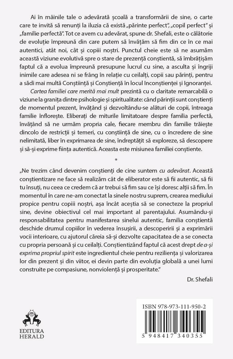 Aceasta carte va va purta intr-o calatorie in care veti trece dincolo de frica si iluziile legate de parentaj si va va ajuta sa deveniti acel parinte care ati visat sa fiti: deplin prezent si constient. Va va inarma cu strategii practice, la indemana, si cu exemple reale de viata, pe care le-am cules din experienta mea ca parinte si psiholog clinician, care demonstreaza extraordinara putere a parentajului constient. Fiecare persoana din familia voastra este gata pentru o trezire a constiintei. Veniti alaturi de mine in aceasta calatorie?"