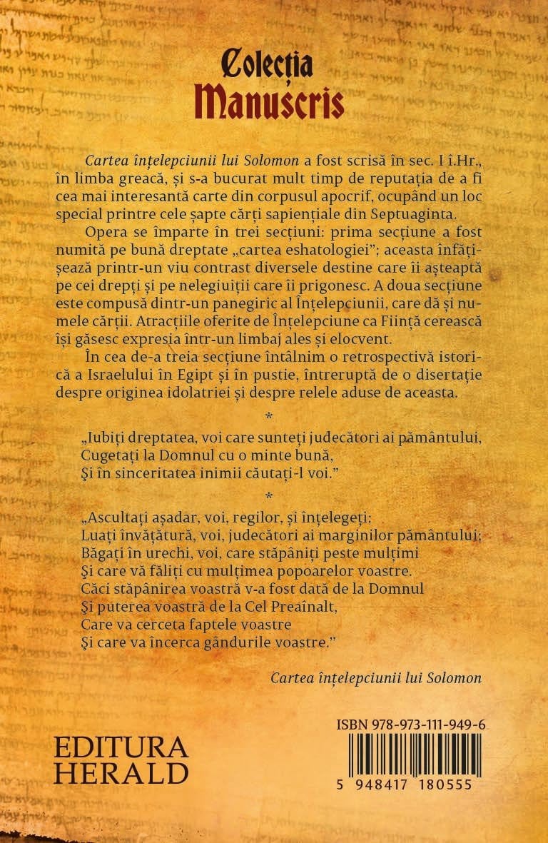 Cartea Intelepciunii lui Solomon a fost scrisa in sec. I i.Hr., in limba greaca, si s‑a bucurat mult timp de reputatia de a fi cea mai interesanta carte din corpusul apocrif, ocupând un loc special printre cele sapte carti sapientiale din Septuaginta.