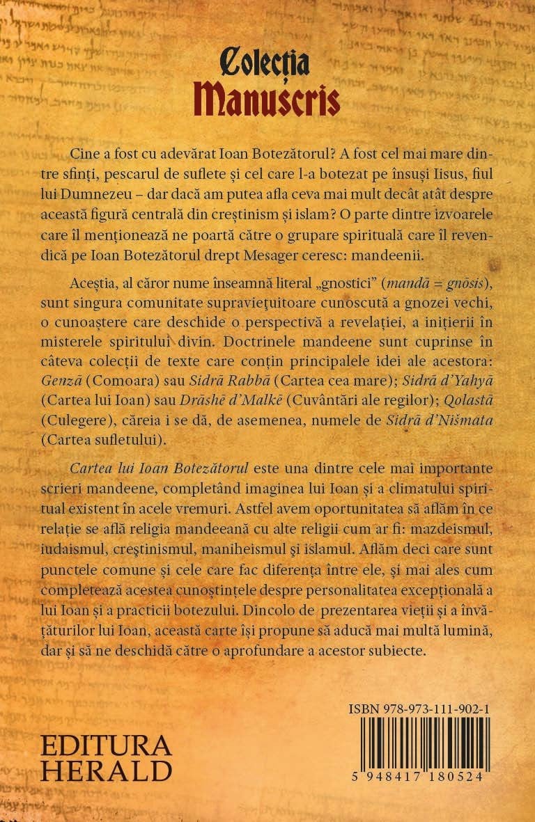 Cartea lui Ioan Botezatorul este una dintre cele mai importante scrieri mandeene, completand imaginea lui Ioan si a climatului spiritual existent in acele vremuri. Astfel avem oportunitatea sa aflam in ce relatie se afla religia mandeeana cu alte religii cum ar fi: mazdeismul, iudaismul, crestinismul, maniheismul si islamul. Aflam deci care sunt punctele comune si cele care fac diferenta intre ele, si mai ales cum completeaza acestea cunostintele despre personalitatea exceptionala a lui Ioan si a practicii botezului. Dincolo de prezentarea vietii si a invataturilor lui Ioan, aceasta carte isi propune sa aduca mai multa lumina, dar si sa ne deschida catre o aprofundare a acestor subiecte.