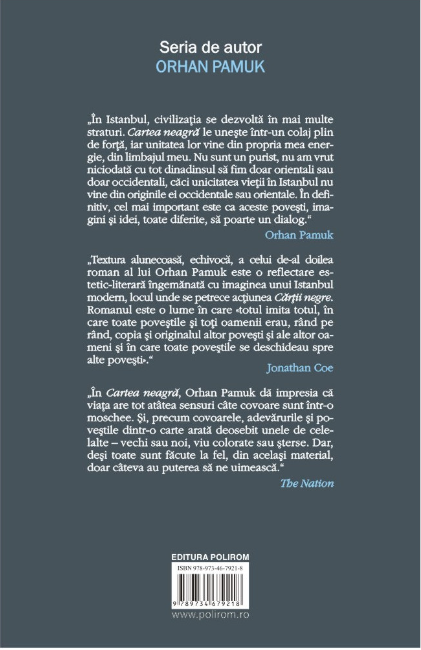 „Textura alunecoasă, echivocă, a celui de-al doilea roman al lui Orhan Pamuk este o reflectare estetic-literară îngemănată cu imaginea unui Istanbul modern, locul unde se petrece acţiunea Cărţii negre. Romanul este o lume în care «totul imita totul, în care toate poveştile şi toţi oamenii erau, rînd pe rînd, copia şi originalul altor poveşti şi ale altor oameni şi în care toate poveştile se deschideau spre alte poveşti».” (Jonathan Coe)