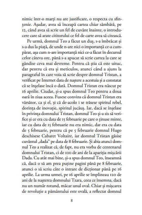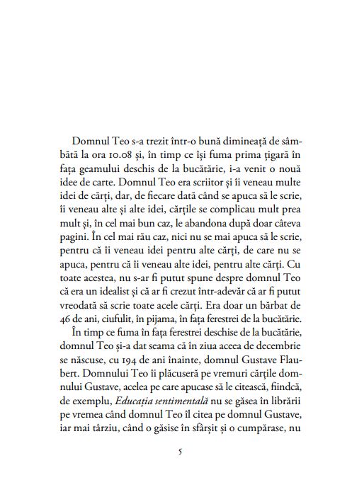 „O carte nu-i altceva decât o înșiruire de cuvinte, de paragrafe, de întâmplări din viețile altora, fie ei adevărați, în carne și oase, fie închipuiți, iar cuvintele și paragrafele și oamenii ăștia sau zebrele sau pinguinii nu fac altceva decât să pozeze, să înregistreze ceva ce există undeva în stimatul cititor și depinde de el dacă e acasă sau nu pentru o carte sau alta, depinde de el dacă-i deschide ușa și o lasă să-i înregistreze sau nu consumul de energie electrică, depinde de el dacă în timp ce citește i se zbârlește părul pe mâini dintr-o cauză sau din alta ori dacă își zice ia mai lasă-mă, frate, cu prostiile astea ori dacă își aduce aminte de mirosul pielii bunicii atunci când se apleca pe deasupra lui să mai îndese bucățica de cașcaval în marginea mămăligii ori dacă citind își proiectează un viitor fericit cu femeia sau cu bărbatul cu care în urmă cu trei zile a împărțit o conservă de ton în ulei și o bere.“ – T.O. BOBE