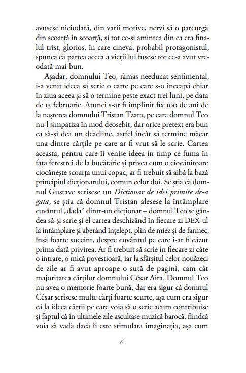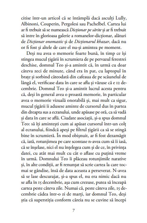 Cartea neisprăvirii surprinde lupta cu literatura, cu procrastinarea, cum se nasc și se dezvoltă ideile domnului Teo, alter ego-ul autorului. Încă de la primele pagini te cucerește poezia vieții de zi cu zi, a ritualului – un colaj între viața domnului Teo și cărțile pe care le-a scris sau ar vrea să le scrie. Este o carte care face trimiteri mai mult sau mai puțin transparente la câțiva dintre marii autori ai lumii: J.L. Borges, Shakespeare, Enrique Vila-Matas și Orhan Pamuk. Amuzantă și gravă totodată, Cartea neisprăvirii devine o reflecție despre literatură și rostul ei, dar și despre risipa de viață și dedublarea pe care le presupune.