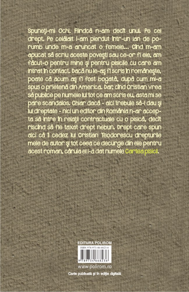 „Spuneţi-mi Ochi. Fiindcă n-am decît unul. Pe cel drept. Pe celălalt l-am pierdut într-un lan de porumb unde m-a aruncat o femeie... Cînd m-am apucat să scriu aceste poveşti sau ce-or fi ele, am făcut-o pentru mine şi pentru pisicile cu care am intrat în contact. Dacă nu le-aş fi scris în româneşte, poate că acum aş fi fost bogată, după cum mi-a spus o prietenă din America. Dar, cînd Cristian vrea să publice pe numele lui tot ce am scris eu, asta mi se pare scandalos. Chiar dacă – aici trebuie să-i dau şi lui dreptate – nici un editor din România n-ar accepta să intre în relaţii contractuale cu o pisică, decît riscînd să fie taxat drept nebun. Drept care spun aici că îi cedez lui Cristian Teodorescu drepturile mele de autor şi tot ceea ce decurge din ele pentru acest roman, căruia el i-a dat numele Cartea pisicii.”