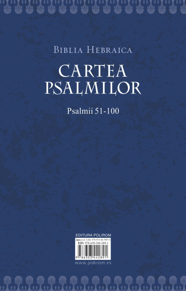 Prima traducere academică, neconfesională a Psalmilor din limba ebraică în limba română, realizată de o echipă formată din doctoranzi și cadre universitare care au absolvit Programul de Studii Iudaice și/sau Programul de Studii Religioase – Texte și Tradiţii din cadrul Facultăţii de Limbi și Literaturi Străine a Universităţii din București. Volumul al II-lea, cuprinzând Psalmii 51-100, urmează modelul volumului I: traducerea din ebraica biblică este însoțită de textul ebraic și de transliterarea lui adaptată fonetic la limba română. Un material audio disponibil online vine în completarea cărții – cinci Psalmi în limba ebraică în lectura dlui Rafael Shaffer, Prim-Rabin al României.