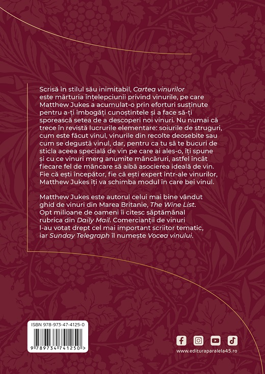 Scrisă în stilul său inimitabil, Cartea vinurilor este mărturia înțelepciunii privind vinurile, pe care Matthew Jukes a acumulat-o prin eforturi susținute pentru a-ți îmbogăți cunoștintele și a face să-ți sporească setea de a descoperi noi vinuri.