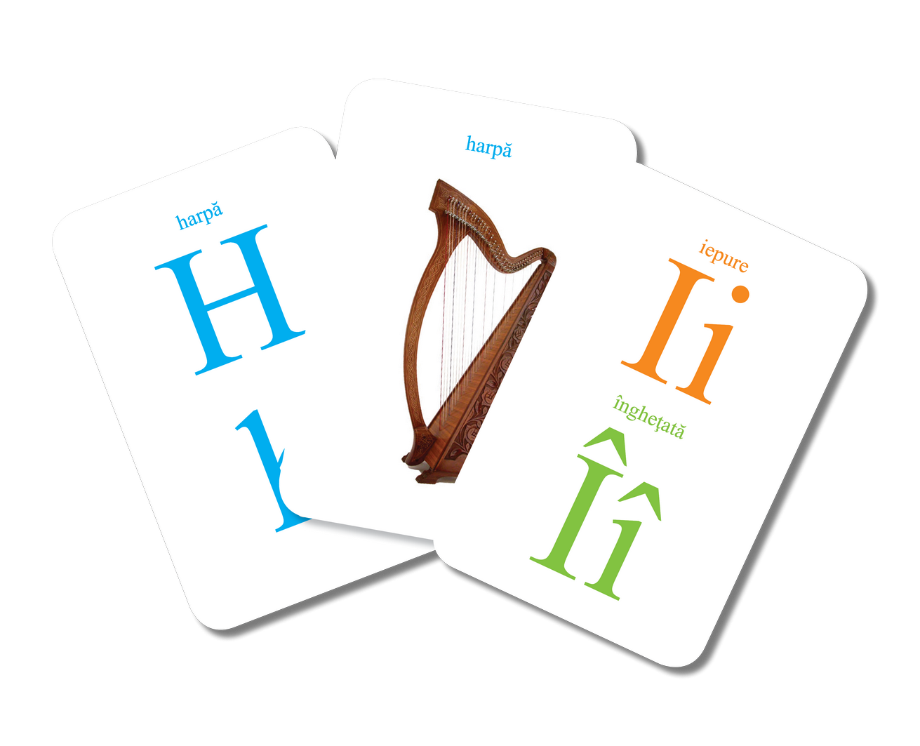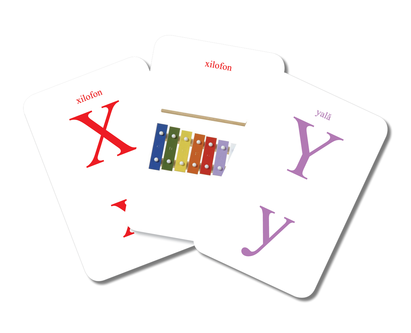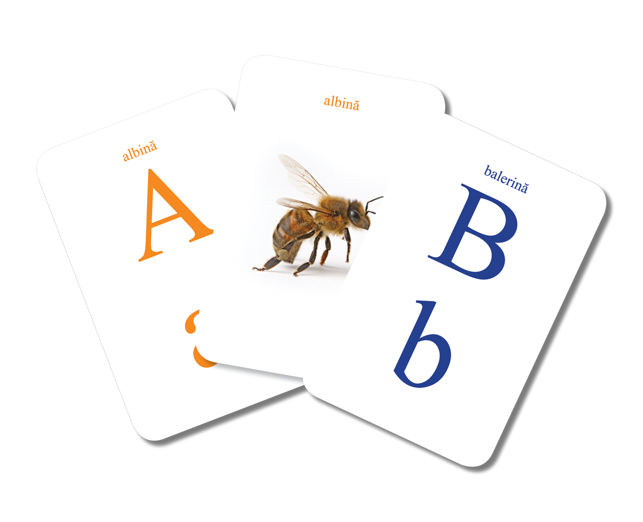 Pachetul conține: · 25 de carduri cu litere mari și mici de tipar · 25 de carduri cu imagini. Scopul jocului este învățarea alfabetului, prin asocierea fiecărei litere cu un cuvânt care începe cu acea literă.