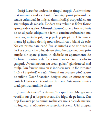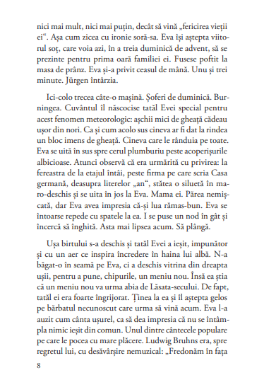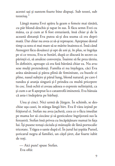 Procesul Auschwitz de la Frankfurt se află în centrul acestui roman, dar povestea se țese în sânul familiei Bruhns: Ludwig si Edith, cârciumari harnici și de treabă, care-și iubesc copiii și nu vor decât să uite trecutul. Fetele Bruhns, Eva si Annegret, nu pot fi mai diferite. Eva, translatoare din polonă la proces, logodită cu fiul unui bogătaș, se trezește însă repede la realitate și își asumă vina. Annegret, mult mai cinică, nu-și asumă istoria, vina cu atât mai puțin. Romanul te ține în tensiune de la prima pagină, te atrage în atmosfera provincială a familiei, te aduce în sala de tribunal și la Auschwitz, în Polonia comunistă, te cufundă în ambianța și mentalitatea anilor ’60 cu o scriitură detașată, cinematografică.