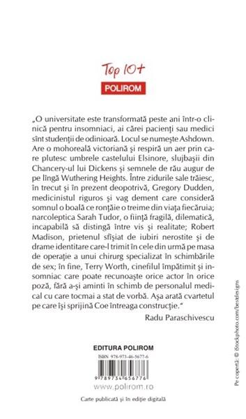 „O universitate este transformata peste ani intr-o clinica pentru insomniaci, ai carei pacienti sau medici sint studentii de odinioara. Locul se numeste Ashdown. Are o mohoreala victoriana si respira un aer prin care plutesc umbrele castelului Elsinore, slujbasii din Chancery-ul lui Dickens si semnele de rau augur de pe linga Wuthering Heights. Intre zidurile sale traiesc, in trecut si in prezent deopotriva, Gregory Dudden, medicinistul riguros si vag dement care considera somnul o boala ce rontaie o treime din viata fiecaruia; narcoleptica Sarah Tudor, o fiinta fragila, dilematica, incapabila sa distinga intre vis si realitate; Robert Madison, prietenul sfisiat de iubiri nerostite si de drame identitare care-l trimit in cele din urma pe masa de operatie a unui chirurg specializat in schimbarile de sex; in fine, Terry Worth, cinefilul impatimit si insomniac care poate recunoaste orice actor in orice poza, fara a-si aminti in schimb de personalul medical cu care tocmai a stat de vorba. Asa arata cvartetul pe care isi sprijina Coe intreaga constructie.” (Radu Paraschivescu)