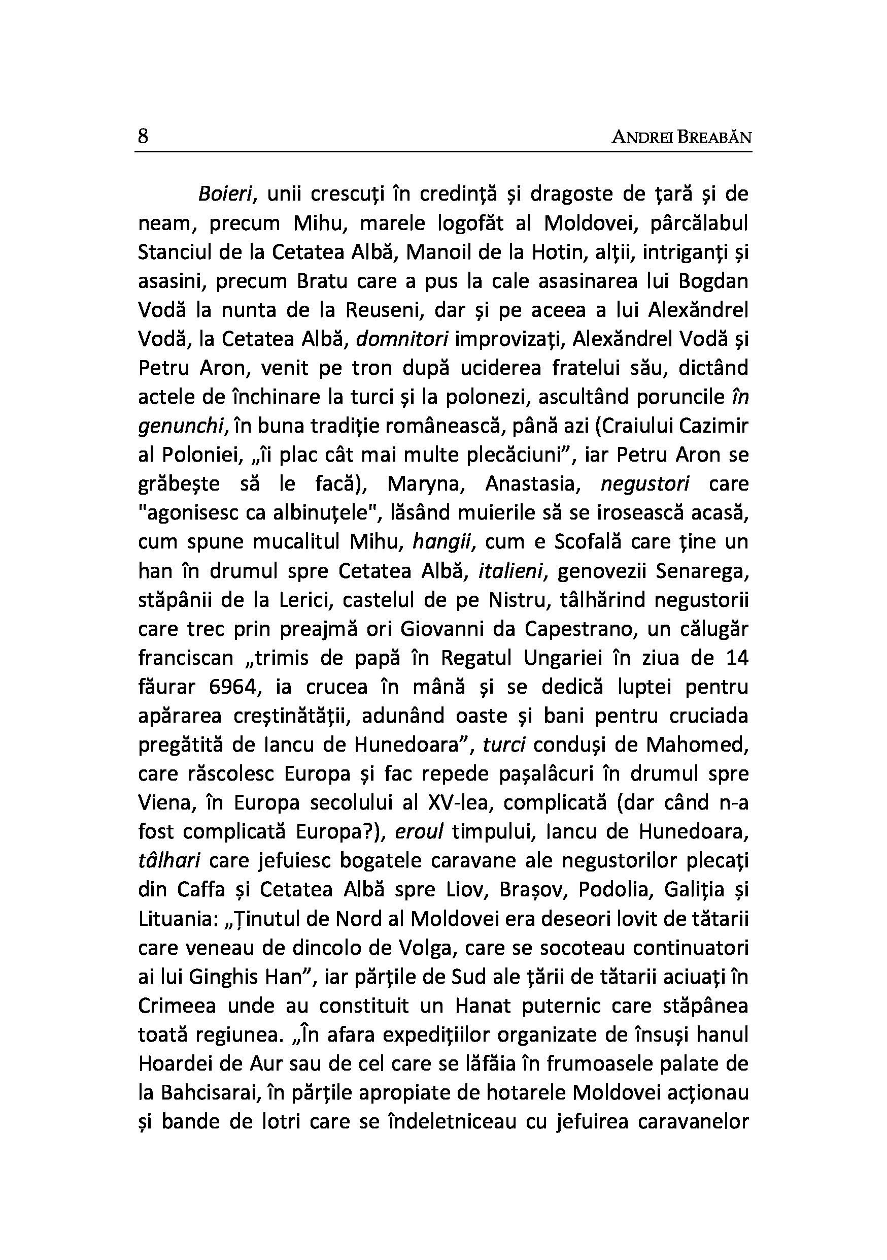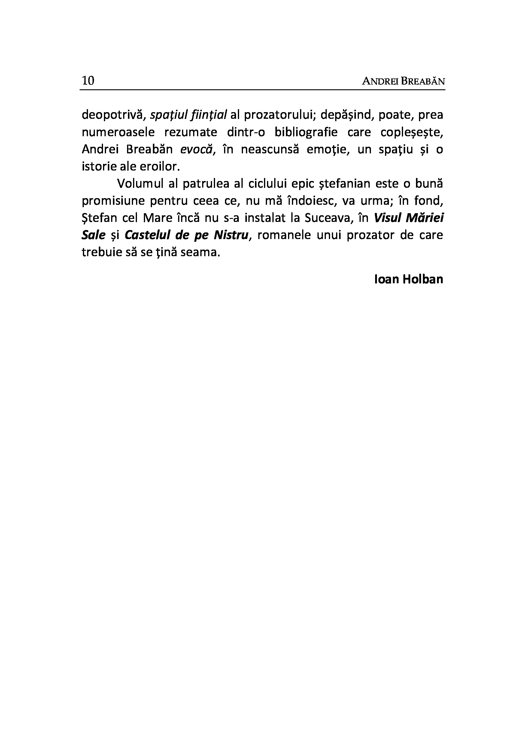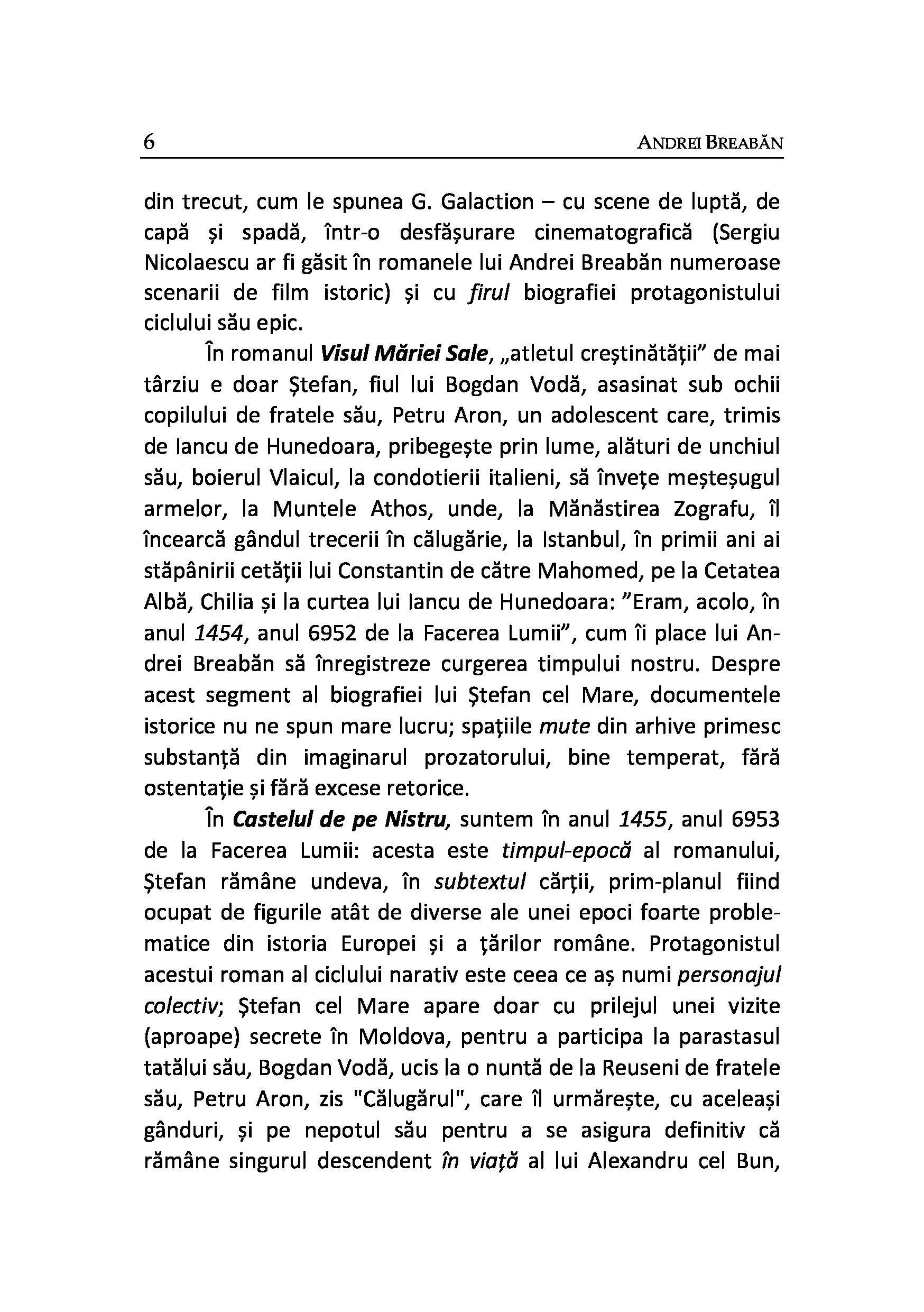 Dincolo de firul narativ care deapana biografia lui Stefan cel Mare, prozatorul are un remarcabil talent in reconstituirea epocii, a Moldovei, in tot cuprinsul sau de atunci, cu Cetatea Alba, Chilia, Castelul Lerici de pe Nistru; Targul Vasluiului, Targul Baia, Suceava, Lapusna, cu datinile pastrate, iata, pana azi, cum sunt obiceiurile de nunta ori parastasul de la Reuseni; iata Castelul de pe Nistru: Castelul Lerici, cu turnurile sale maiestuoase, se oglindea mandru in apele Nistrului, care formau ceva mai la vale un liman larg pregatindu-se sa se verse in mare. Apele jucause ale raului se jucau zburdalnic cu valurile inspumate, care veneau dinspre mare lasand la plecare ceva din sarea care le prisosea, ca semn al bunavointei cu care le primea spre a se uni cu ele spre eternitate. Ridicat chiar pe malul Nistrului, pentru a fi mai usor de aparat, apele leganate de vant se loveau fara tihna de zidurile de piatra ale Castelului pe care le spalau de praful venit dinspre uscat, adus peste ele de acelasi vant jucaus, astfel ca zilnic se luau la intrecere care sa lase mai multe urme pe ele. Moldova lui Andrei Breaban este un spatiu identitar al neamului si, deopotriva, spatiul fiintial al prozatorului; depasind, poate, prea numeroasele rezumate dintr-o bibliografie care copleseste, Andrei Breaban evoca, in neascunsa emotie, un spatiu si o istorie ale eroilor. - Ioan Holban