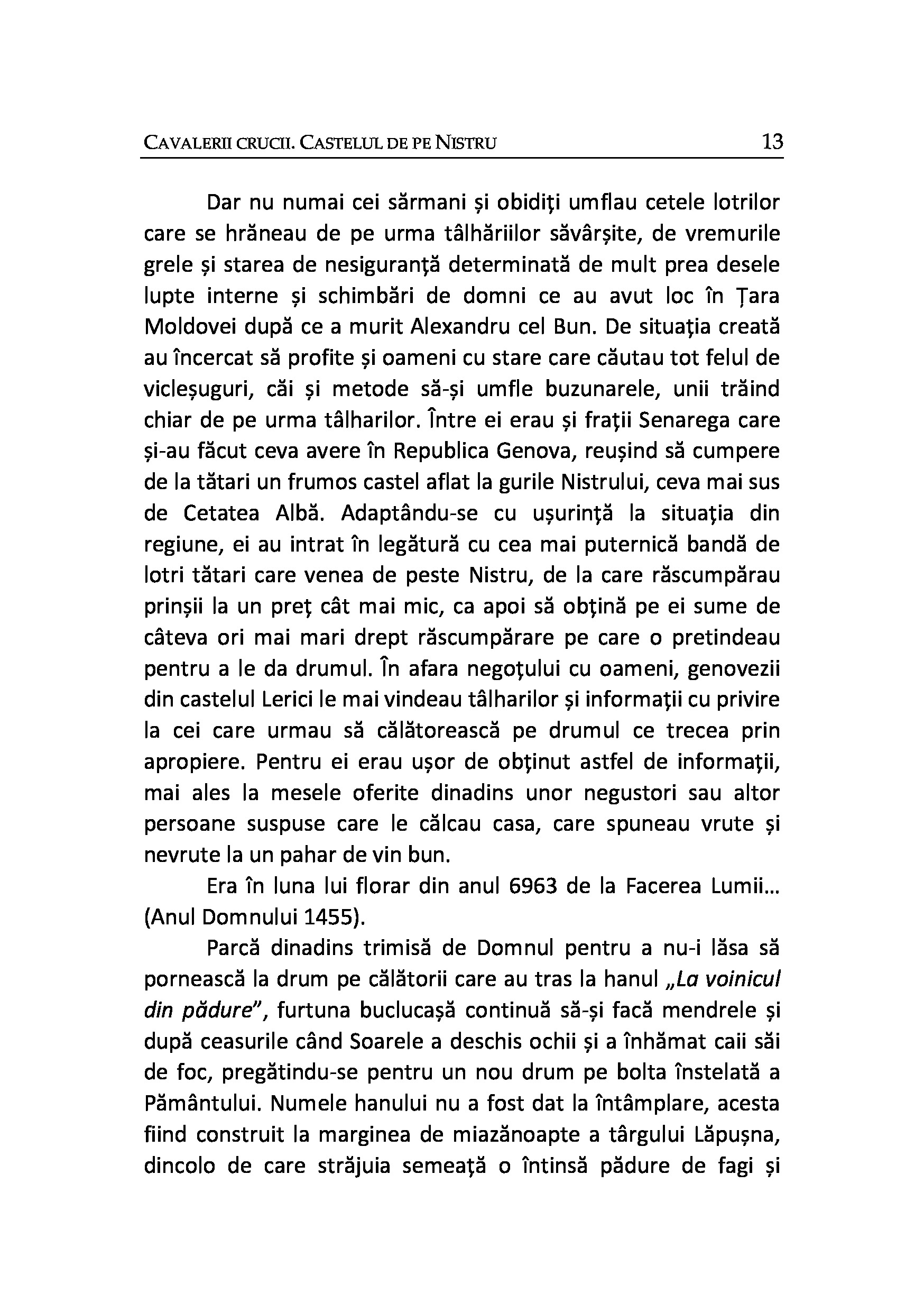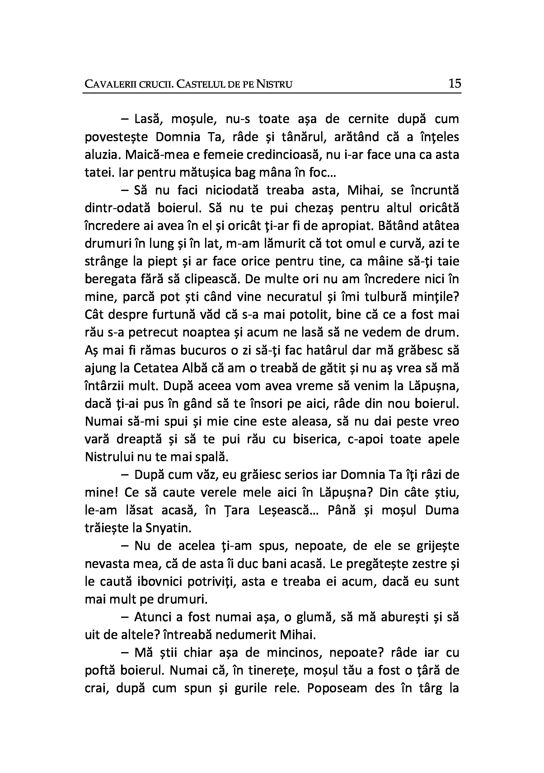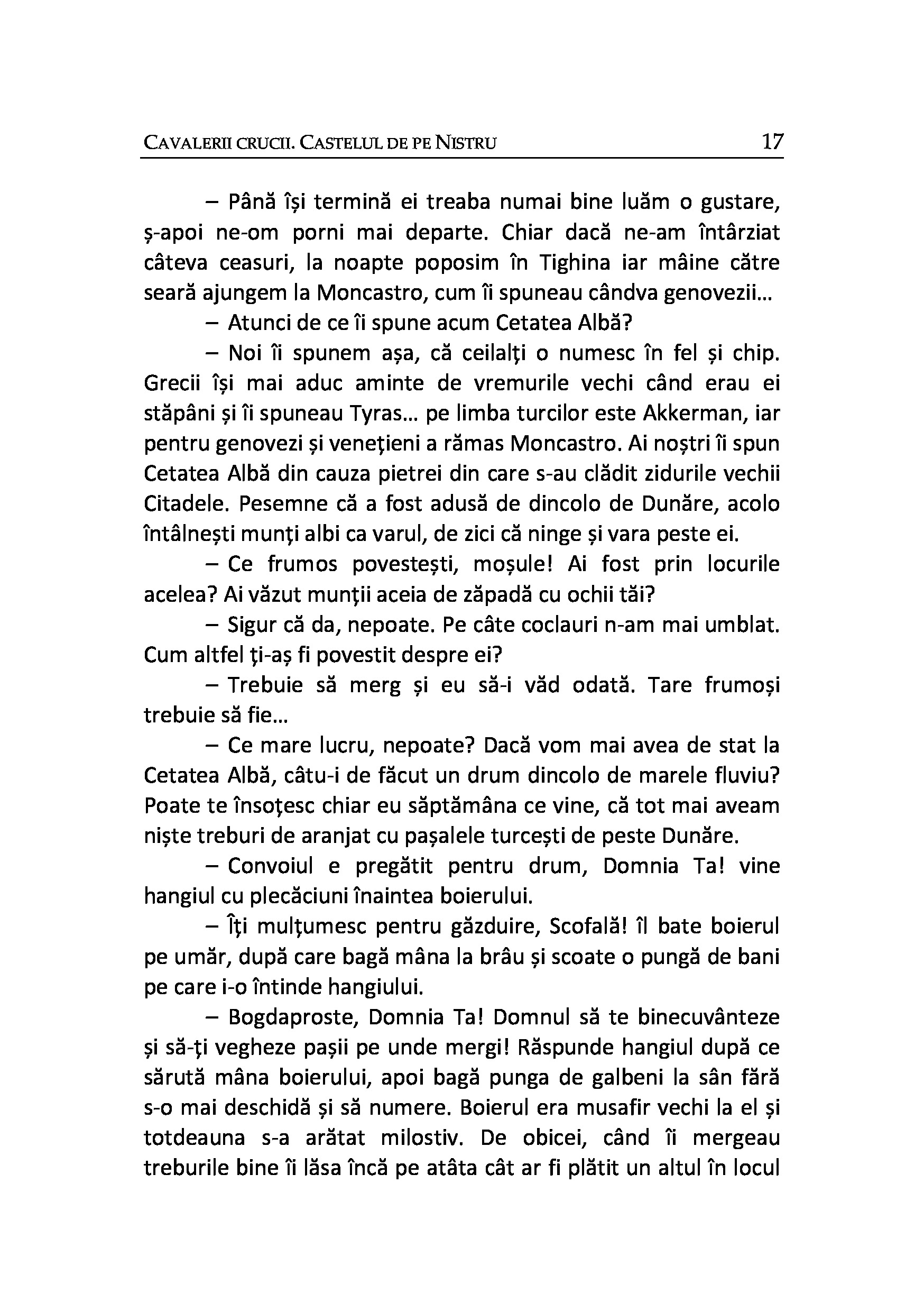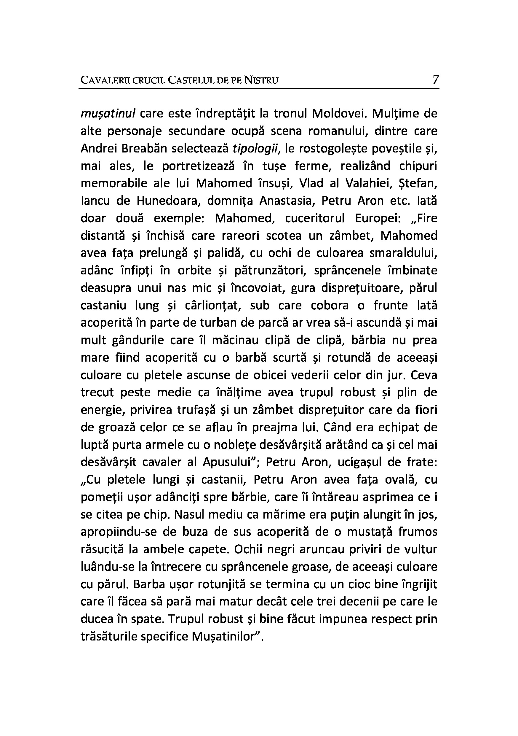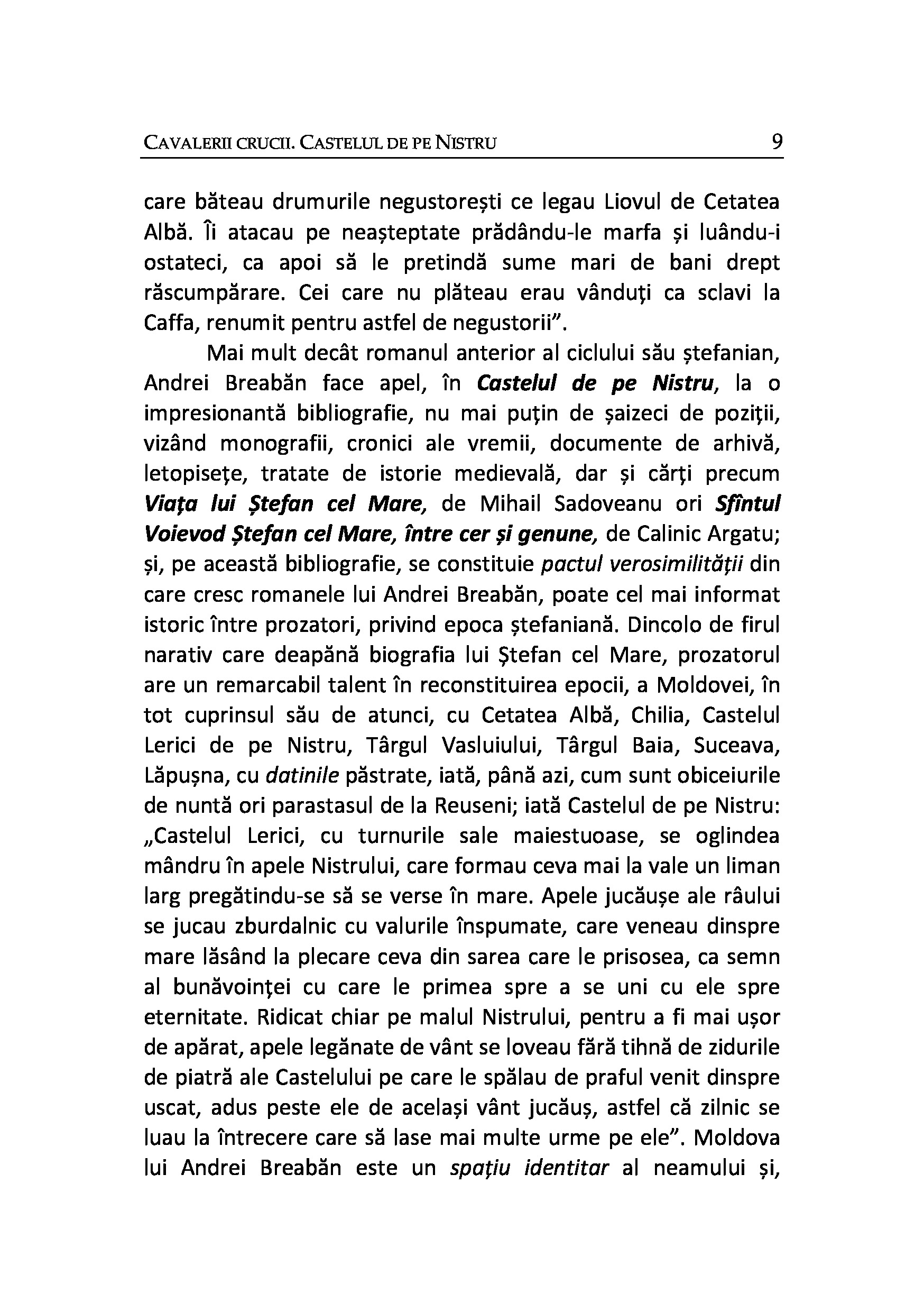 Castelul de pe Nistru, romanul istoric al lui Andrei Breaban, aduna ingredientele unei proze deschise receptarii de catre un public variat - de la adolescentul atras de aventura si povesti de dragoste, la maturul inclinat spre meditatia asupra istoriei. Andrei Breaban dovedeste, ca scriitor, o capacitate apreciabila de a stapani documentul istoric, de a-l absorbi, in mare parte in fictiune, tinand in cumpana talerele povestii si ale istoriei. Veridicitatea sustine verosimilitatea faptelor istorice si le aduce in aura literaturii. - Ana Dobre