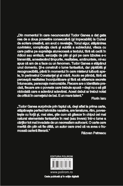 „Din momentul in care necunoscutul Tudor Ganea a dat gata cea de a doua povestire consecutiva (si impecabila) la Cursul de scriere creativa, am avut o revelatie. Tonul sigur, stapinirea cuvintelor, complicatia clara si subtila a subiectului, viteza cu care patina pe suprafata alunecoasa a textului, fara sa cada in ridicol sau emfaza, senzatia de plin si gol pe care izbutea s-o transmita, amestecind timpurile, realitatea, amanuntele, mi-au spus ca am de a face cu un fenomen. Tudor Ganea e stapinul unui domeniu. Si-a construit o lume fantastica, dar pipaibila si recognoscibila, pina in momentul in care misterul tulbura apele, in perimetrul Constantei si al marii. Acolo se plimba, fara sa perceapa realitatea inconjuratoare si fara sa elibereze secrete intunecate, personaje memorabile. Fiecare are o identitate precisa, fiecare are o poveste care trebuie spusa – desi nu o sa stii niciodata care e adevarul adevarat. Acest debut ar trebui notat de critica in carnetelul de bal. E un mare talent.” (Florin Iaru)