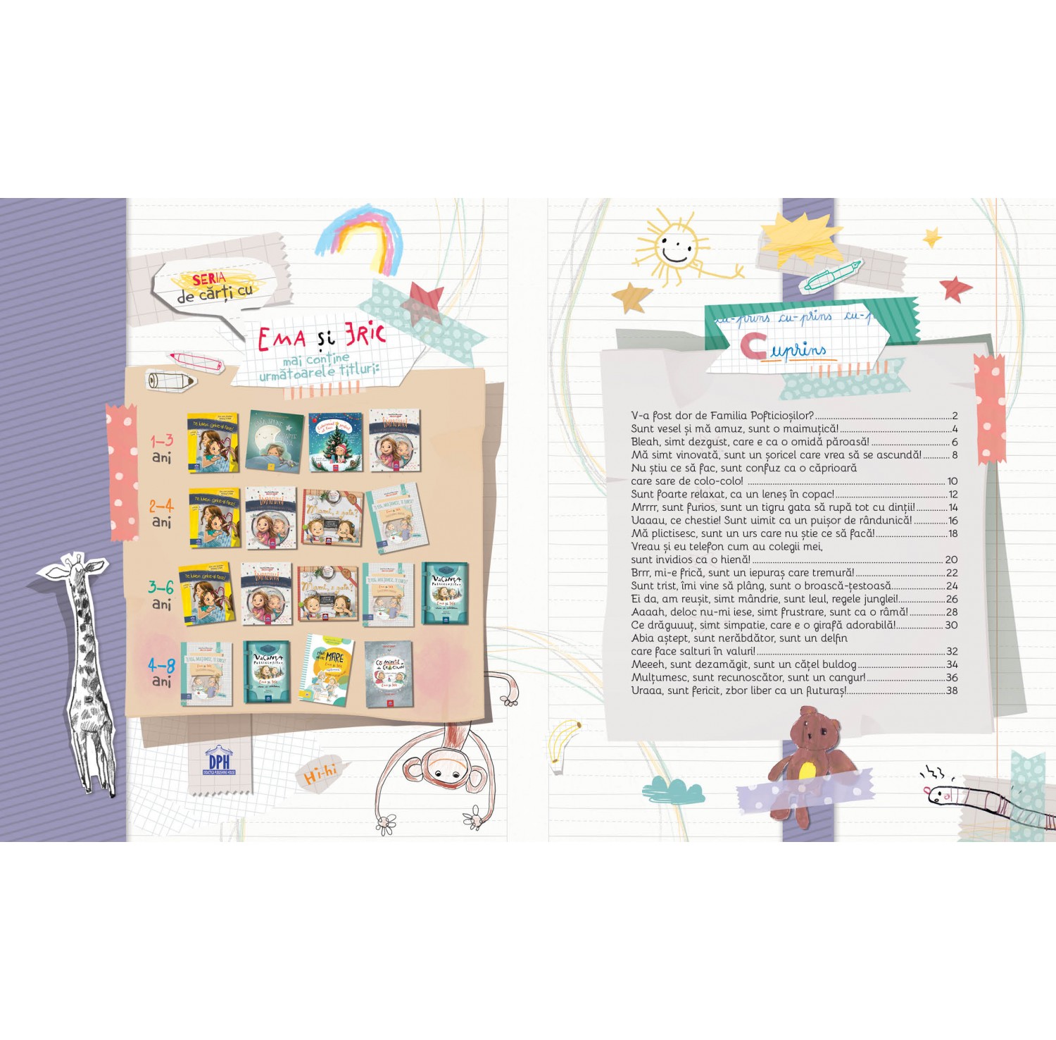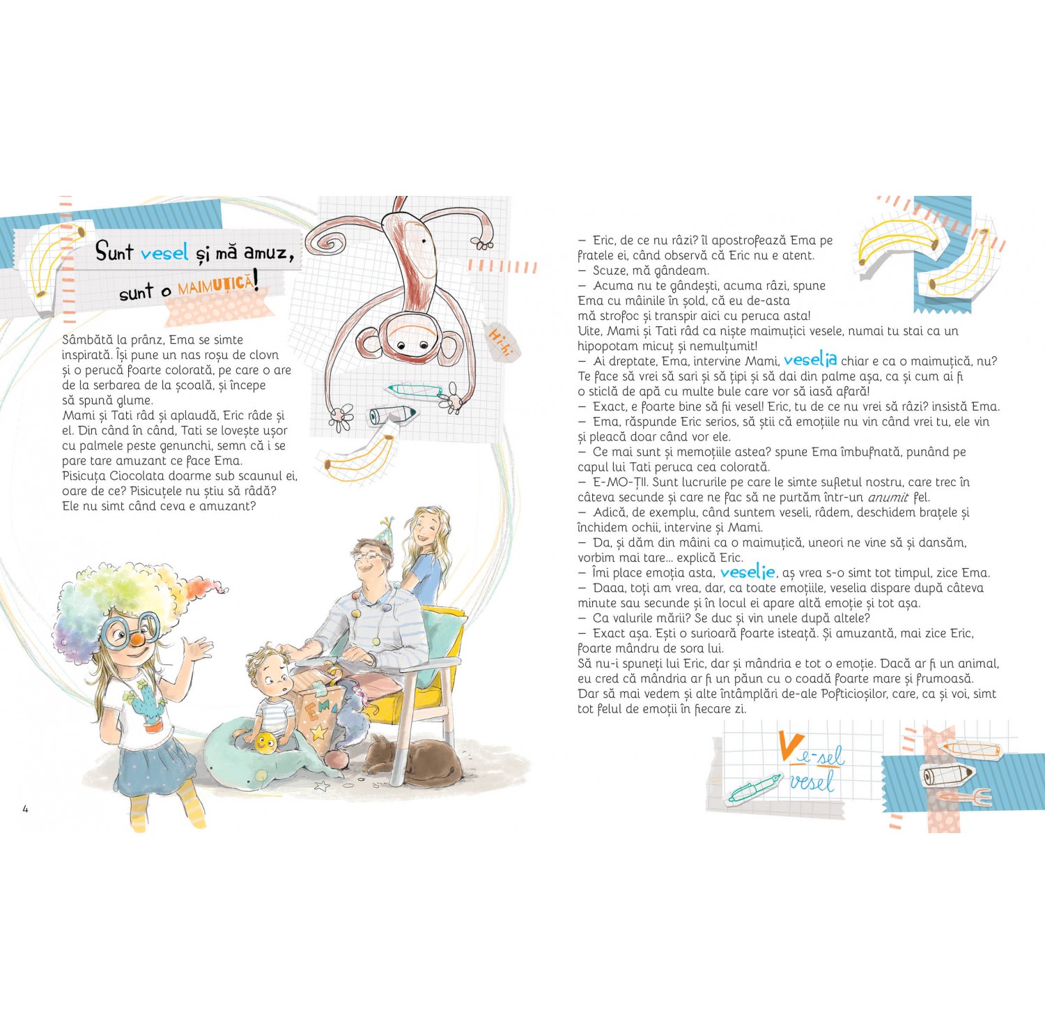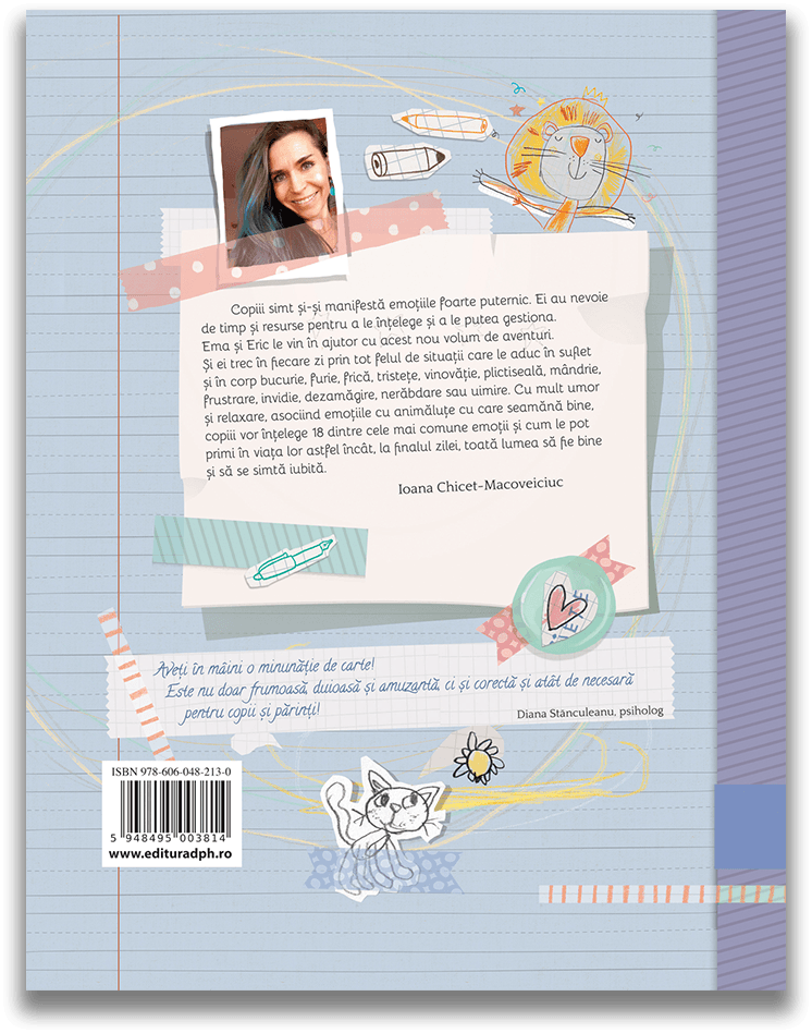 Copiii simt să-și manifeste emoțiile foarte puternic. Ei au nevoie de timp și resurse pentru a le înțelege și a le putea gestiona. Ema și Eric le vin în ajutor cu acest nou volum de aventuri. Și ei trec în fiecare zi prin tot felul de situații care le aduc în suflet și în corp bucurie, furie, frică, tristețe, vinovăție, plictiseală, mândrie, frustrare, invidie, dezamăgire, nerăbdare sau uimire. Cu mult umor și relaxare, asociind emoțiile cu animăluțe cu care seamănă bine, copiii vor înțelege 18 dintre cele mai comune emoții și cum le pot primi în viața lor astfel încât, la finalul zilei, toată lumea să fie bine și să se simtă iubită.