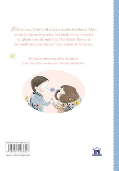 Ce dulce este impacarea intre frati! este o poveste minunata si plina de duiosie, prin care copiii cu varsta peste 3 ani vor descoperi bucuria impacarii. Cristina si Alex sunt doi frati fermecatori, absorbit fiecare de pasiunea lui. Lui Alex ii place sa faca construtii, iar Cristinei sa citeasa si sa deseneze. Se joaca frumos singuri pana cand, fara sa vrea, Cristina ii strica o jucarie fratelui ei, si cei doi ajung sa se certe. In inimile lor se formeaza un mare ghem de suparare. Dar iubirea dintre ei este mult mai puternica si fratii reusesc sa faca pace. Haideti sa descoperim impreuna momentele de suparare prin care au trecut cei doi frati si cum au reusit sa le depaseasca.