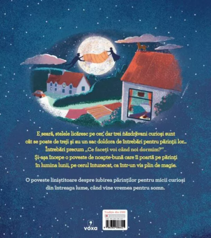 Și-așa începe o poveste de noapte-bună care îi poartă pe părinţi în lumina lunii, pe cerul întunecat, ca într-un vis plin de magie.