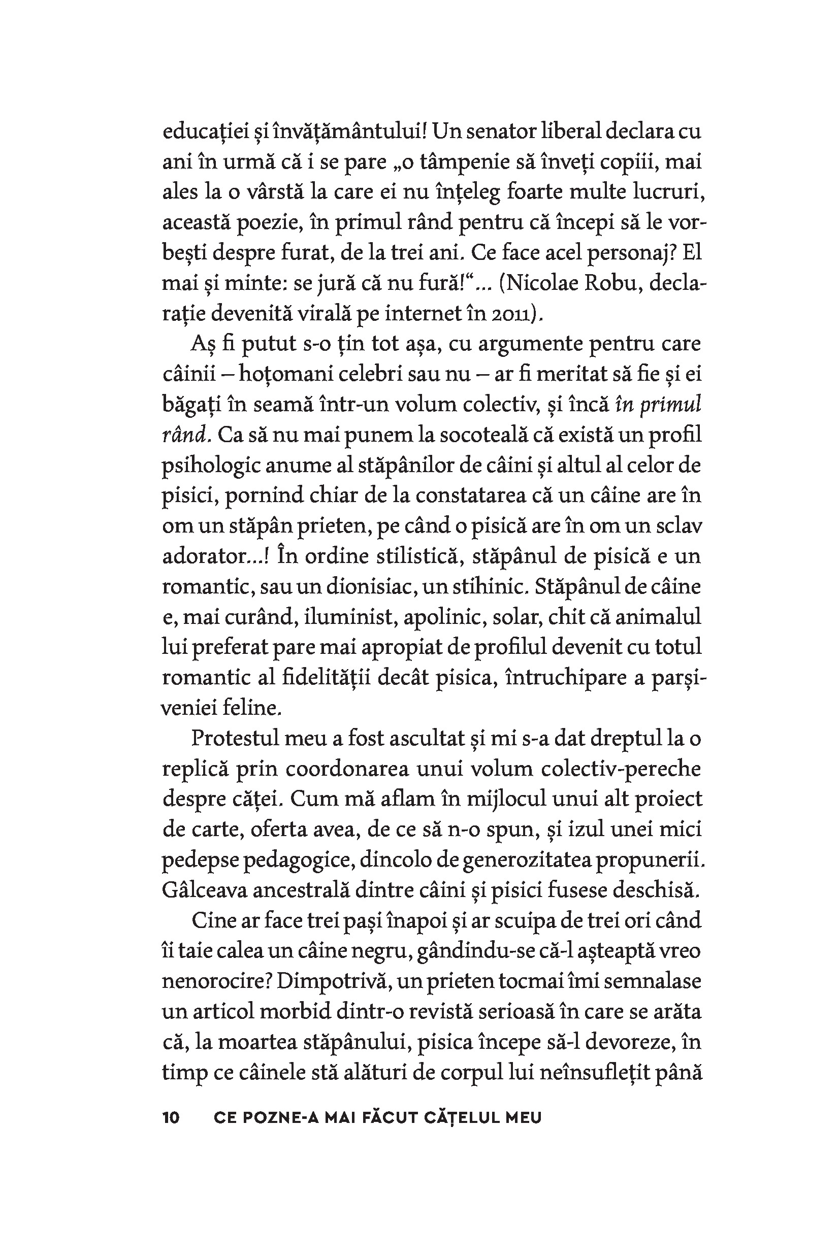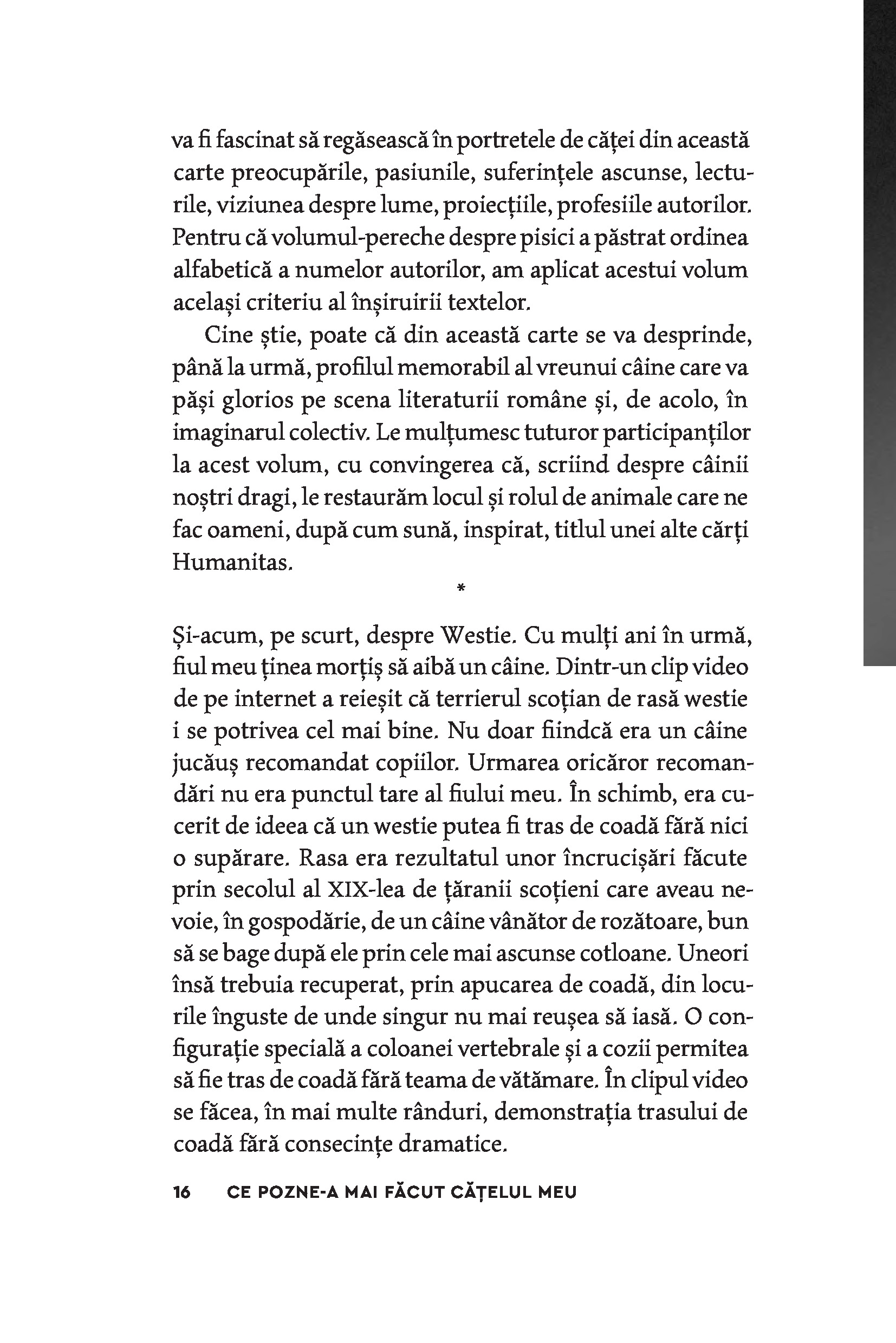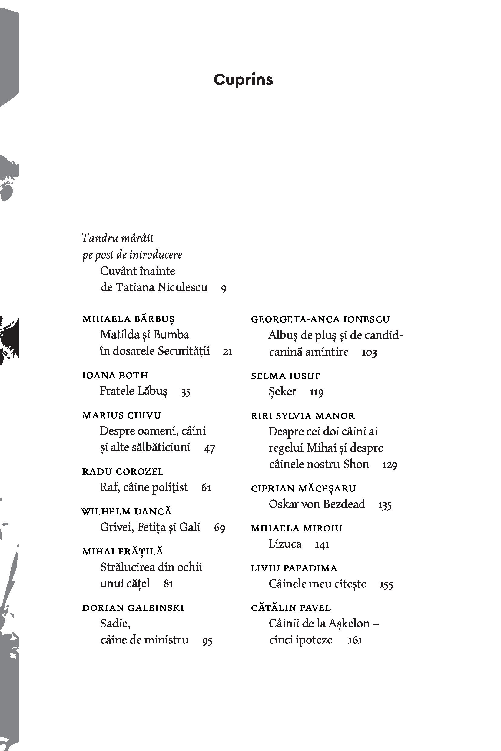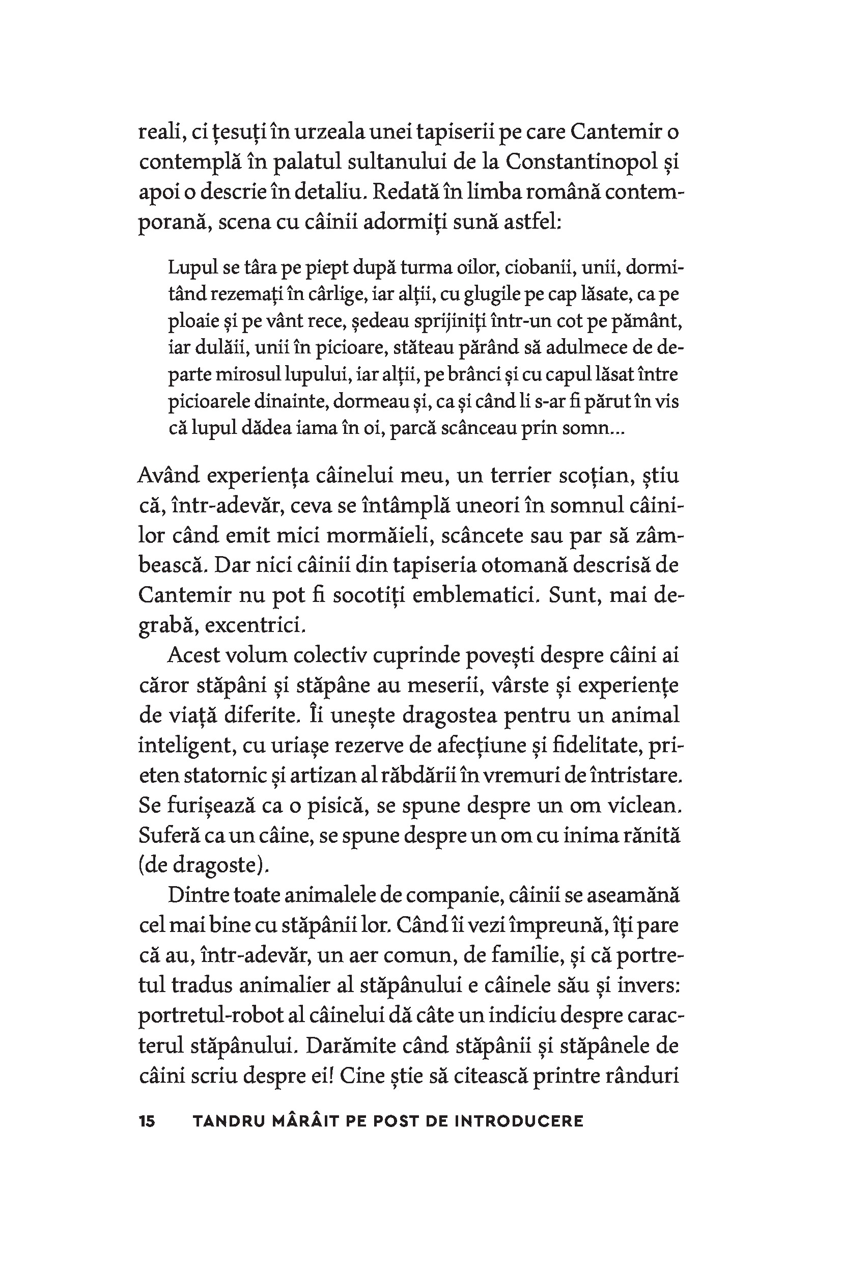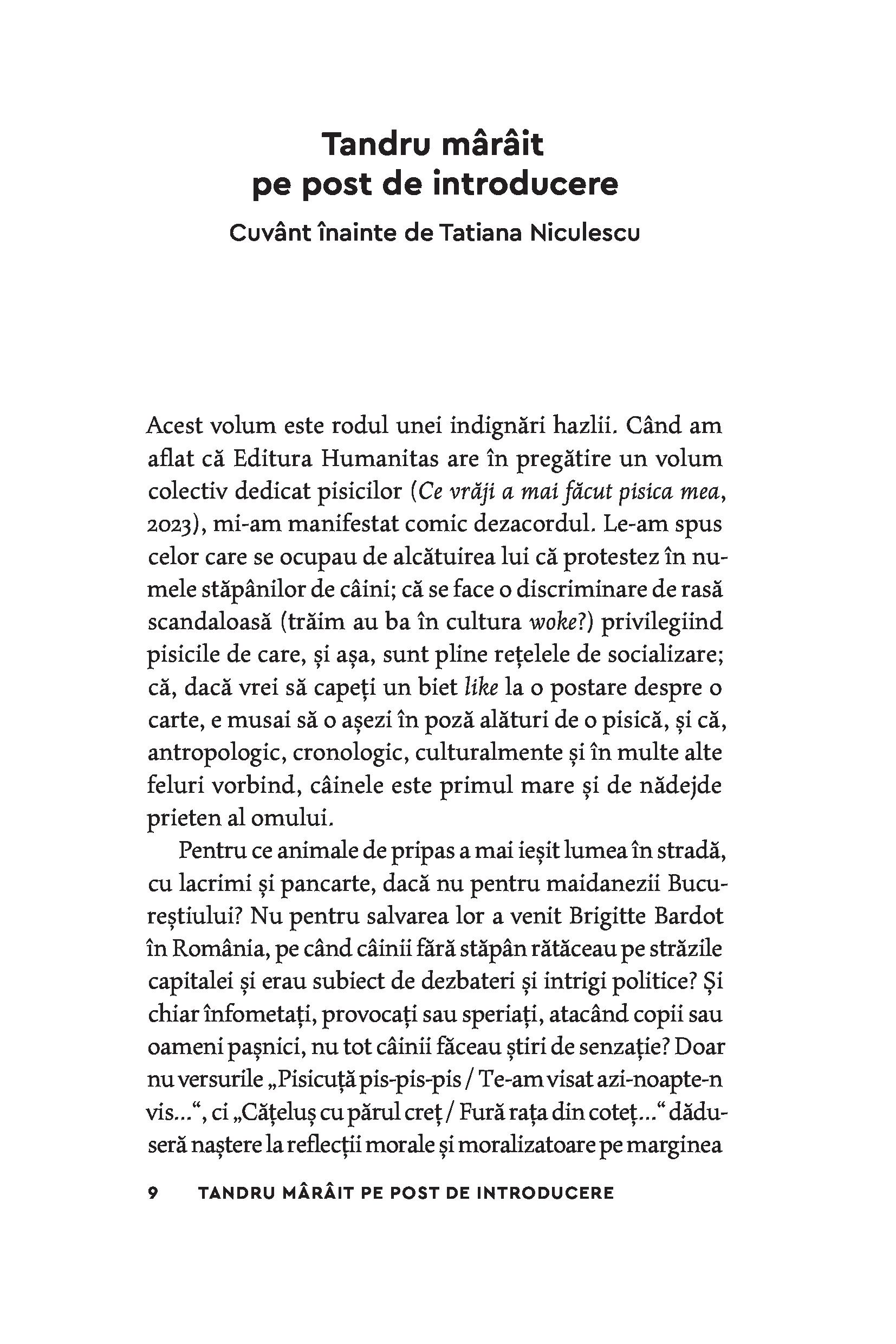 Acest volum este rodul unei indignări hazlii. Când am aflat că Editura Humanitas avea în pregătire un volum colectiv dedicat pisicilor (Ce vrăji a mai făcut pisica mea, 2023), mi-am manifestat comic dezacordul, protestând în numele stăpânilor de câini. Protestul meu a devenit o carte cu poze și povești despre căței spuse de stăpânii lor. Iar cartea li se adresează tuturor iubitorilor de animale.“ — Tatiana Niculescu