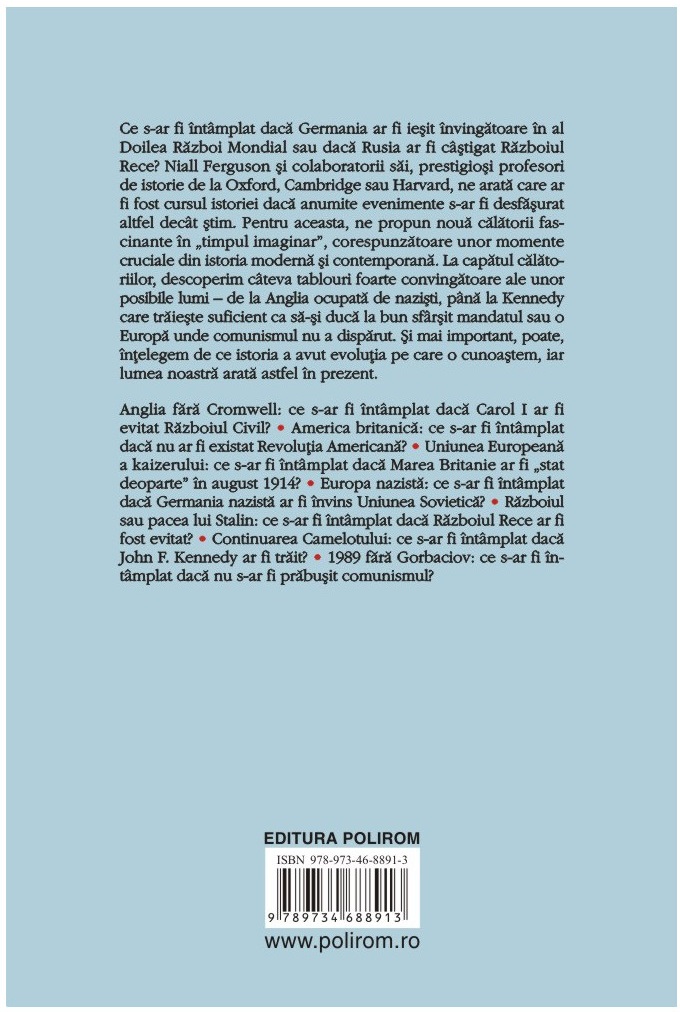 Ce s-ar fi întâmplat dacă Germania ar fi ieșit învingătoare în al Doilea Război Mondial sau dacă Rusia ar fi câștigat Războiul Rece? Niall Ferguson și colaboratorii săi, prestigioși profesori de istorie de la Oxford, Cambridge sau Harvard, ne arată care ar fi fost cursul istoriei dacă anumite evenimente s-ar fi desfășurat altfel decât știm. Pentru aceasta, ne propun nouă călătorii fascinante în „timpul imaginar”, corespunzătoare unor momente cruciale din istoria modernă și contemporană. La capătul călătoriilor, descoperim câteva tablouri foarte convingătoare ale unor posibile lumi – de la Anglia ocupată de naziști, până la Kennedy care trăiește suficient ca să-și ducă la bun sfârșit mandatul sau o Europă unde comunismul nu a dispărut. Și mai important, poate, înțelegem de ce istoria a avut evoluția pe care o cunoaștem, iar lumea noastră arată astfel în prezent.