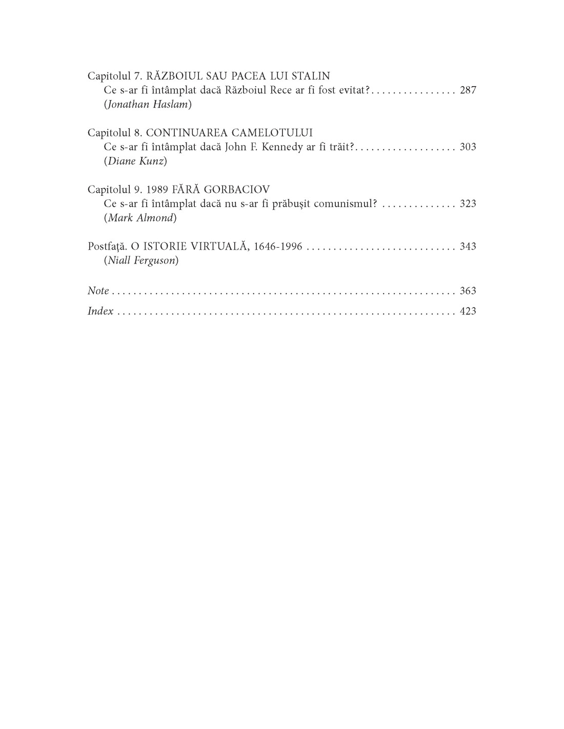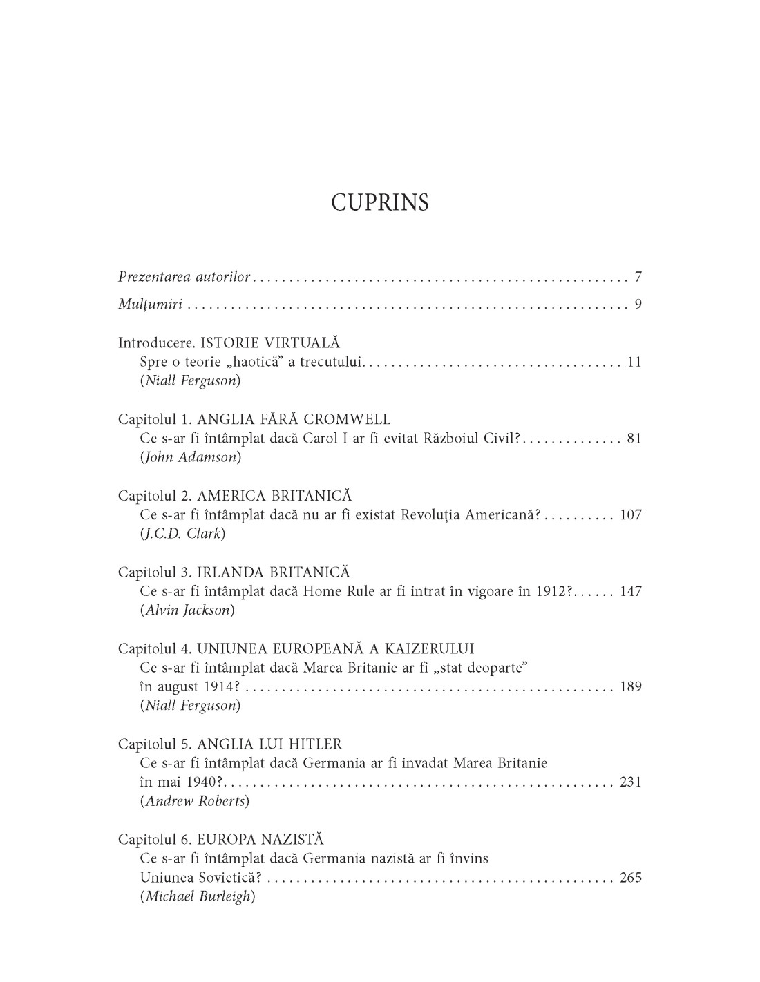 Anglia fără Cromwell: ce s-ar fi întâmplat dacă Carol I ar fi evitat Războiul Civil? • America britanică: ce s-ar fi întâmplat dacă nu ar fi existat Revoluția Americană? • Uniunea Europeană a kaizerului: ce s‑ar fi întâmplat dacă Marea Britanie ar fi „stat deoparte” în august 1914? • Europa nazistă: ce s-ar fi întâmplat dacă Germania nazistă ar fi învins Uniunea Sovietică? • Războiul sau pacea lui Stalin: ce s-ar fi întâmplat dacă Războiul Rece ar fi fost evitat? • Continuarea Camelotului: ce s-ar fi întâmplat dacă John F. Kennedy ar fi trăit? • 1989 fără Gorbaciov: ce s-ar fi întâmplat dacă nu s-ar fi prăbușit comunismul?