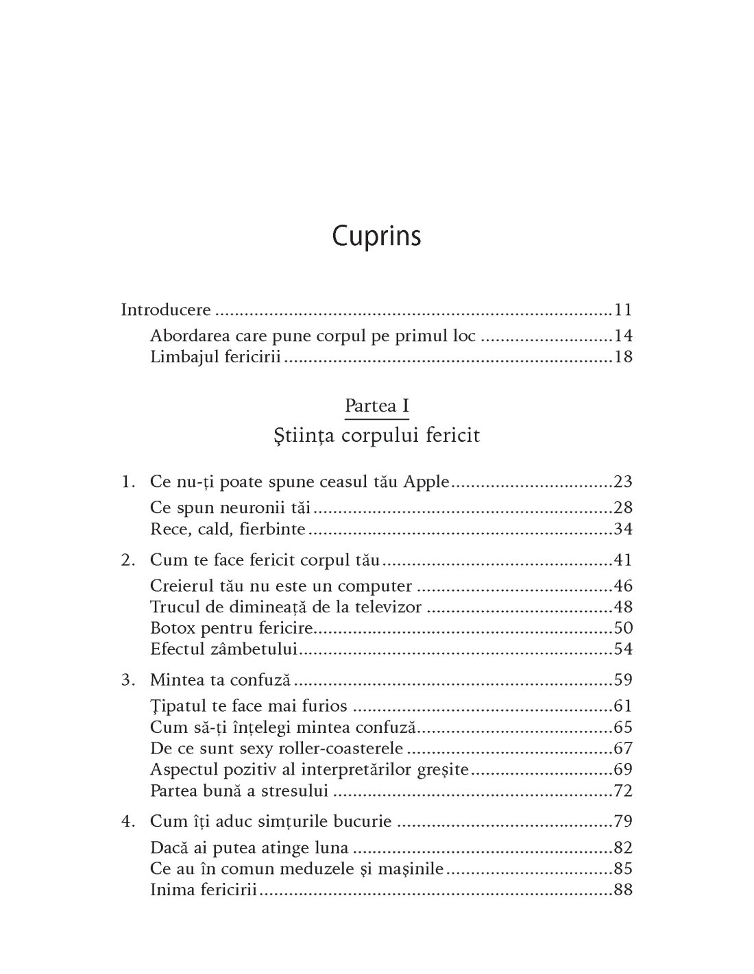 Corpul este adesea mai inteligent decât mintea și îi poate dicta acesteia ce să simtă, susține autoarea; chiar și schimbări minore pot avea un impact neașteptat asupra calității vieții și a stării noastre de bine. Iată câteva idei eficiente, ușor de pus în practică, care ne pot aduce zilnic mai multă bucurie: