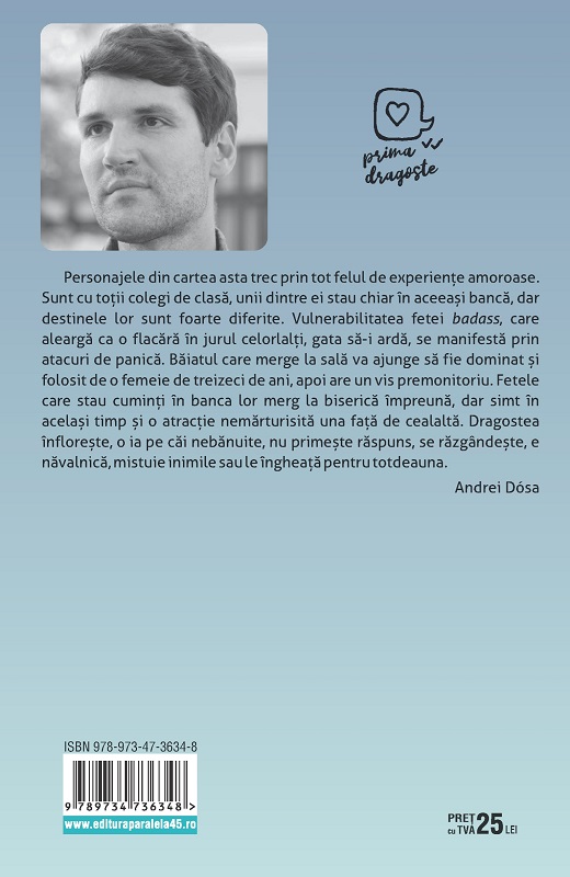 Personajele din cartea asta trec prin tot felul de experienţe amoroase. Sunt cu toţii colegi de clasă, unii dintre ei stau chiar în aceeași bancă, dar destinele lor sunt foarte diferite. Vulnerabilitatea fetei badass, care aleargă ca o flacără în jurul celorlalţi, gata să-i ardă, se manifestă prin atacuri de panică. Băiatul care merge la sală va ajunge să fie dominat și folosit de o femeie de treizeci de ani, apoi are un vis premonitoriu. Fetele care stau cuminţi în banca lor merg la biserică împreună, dar simt în același timp și o atracţie nemărturisită una faţă de cealaltă. Dragostea înflorește, o ia pe căi nebănuite, nu primește răspuns, se răzgândește, e năvalnică, mistuie inimile sau le îngheaţă pentru totdeauna.