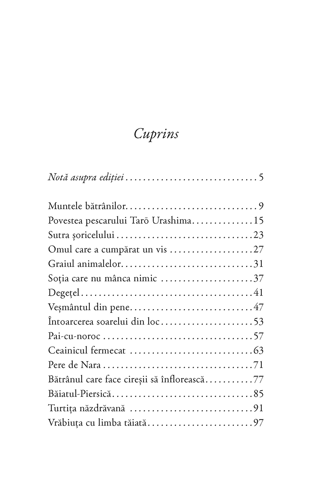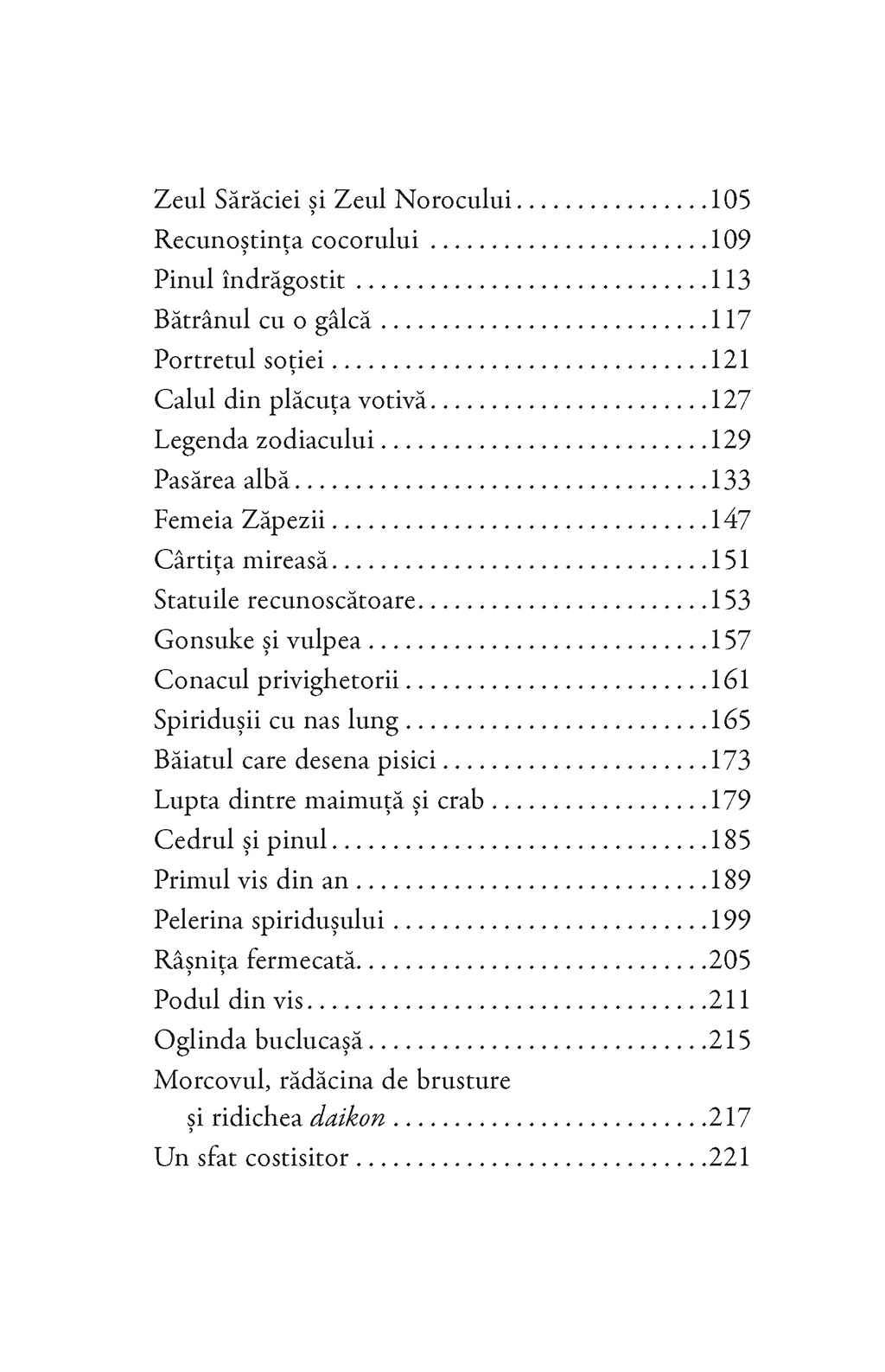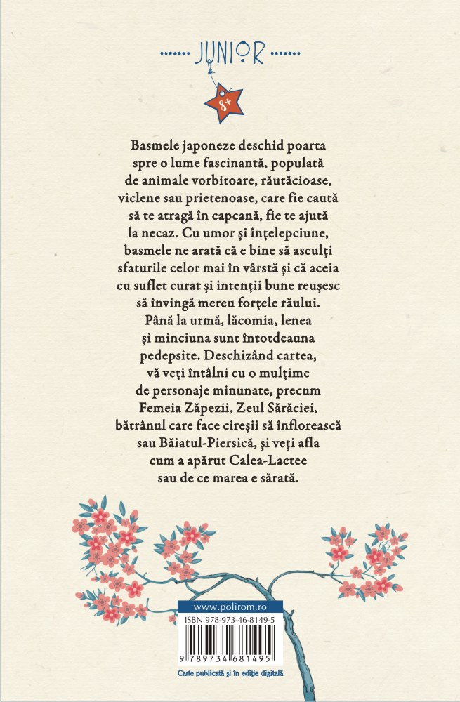 Basmele japoneze deschid poarta spre o lume fascinantă, populată de animale vorbitoare, răutăcioase, viclene sau prietenoase, care fie caută să te atragă în capcană, fie te ajută la necaz. Cu umor și înţelepciune, basmele ne arată că e bine să asculţi sfaturile celor mai în vîrstă și că aceia cu suflet curat și intenţii bune reușesc să învingă mereu forţele răului. Pînă la urmă, lăcomia, lenea și minciuna sînt întotdeauna pedepsite. Deschizînd cartea, vă veţi întîlni cu o mulţime de personaje minunate, precum Femeia Zăpezii, Zeul Sărăciei, bătrînul care face cireșii să înflorească sau Băiatul-Piersică, și veţi afla cum a apărut Calea-Lactee sau de ce marea e sărată.