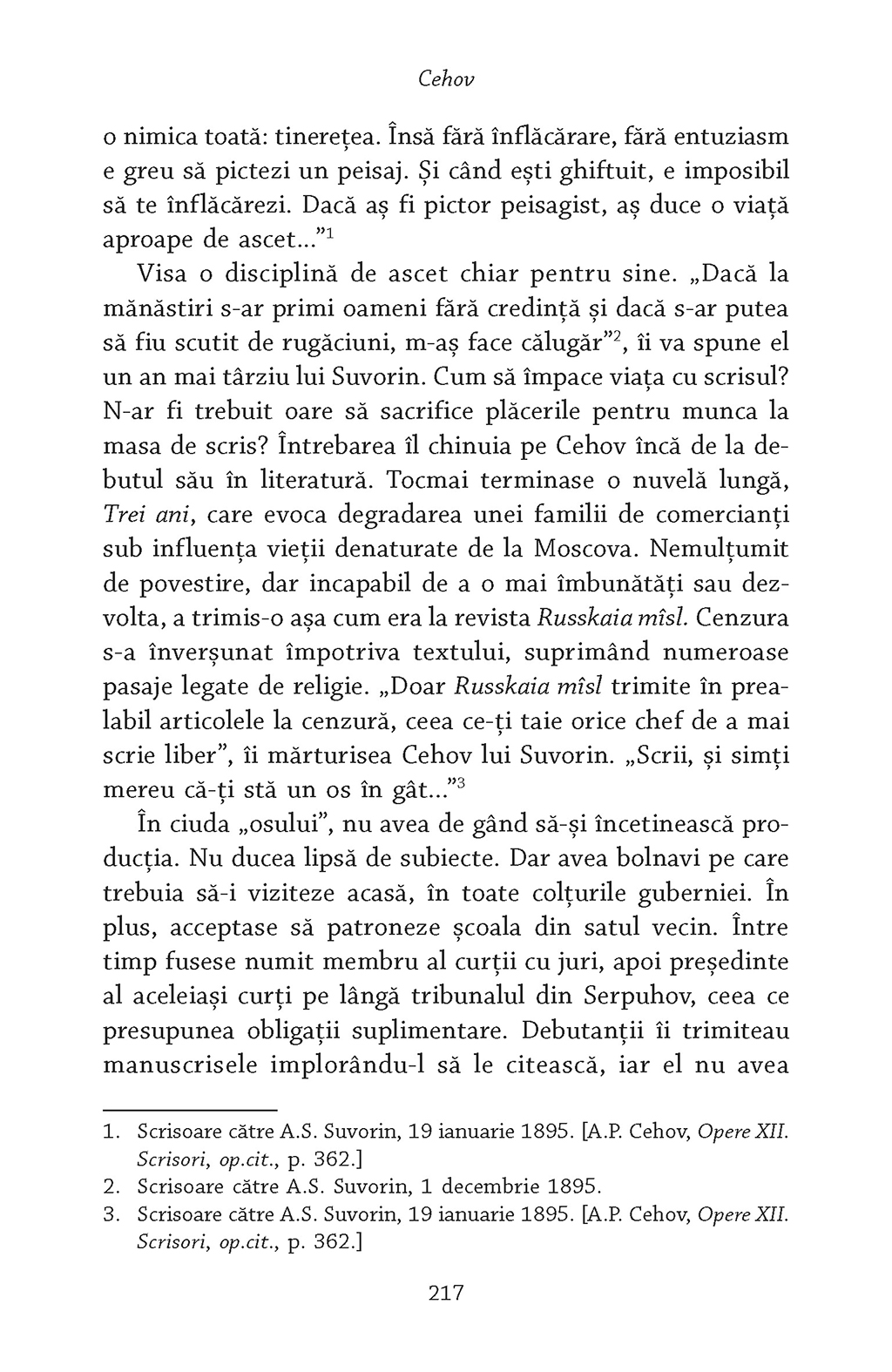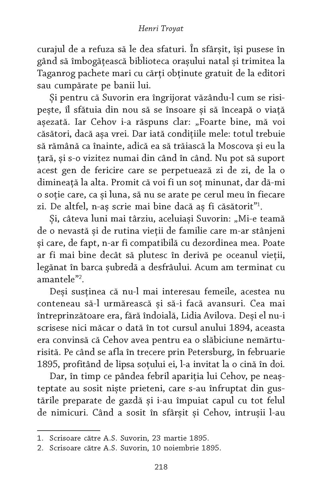 „Cehov mă încîntă prin modestia, rectitudinea morală, fermitatea, stoicismul lui surîzător. Era sceptic, dar credea cu candoare în perfectibilitatea speciei umane. Îi plăcea să rîdă, dar bucuria lui avea un fond de tristețe. Era generos, sociabil, dar prietenii nu îl puteau cunoaște cu adevărat. Se dedica profesiunii sale de medic cu pasiune, dar în același timp, deși bolnav de tuberculoză, lucra cu înverșunare la o operă literară în care nu-și punea mari speranțe.” (Henri Troyat)