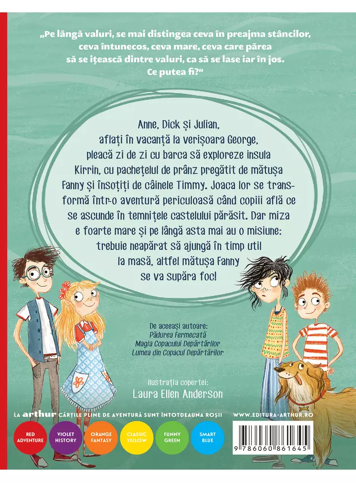 Anne, Dick și Julian, aflați în vacanță la domnișoara George, pleacă zi de zi cu barca să exploreze insula Kirrin, cu pachețelul de prânz pregătit de mătușa Fanny și însoțiți de câinele Timmy. Joaca lor se transformă într-o aventură periculoasă când copiii află ce se ascunde în temnițele castelului părăsit. Dar miza e foarte mare și pe lângă asta mai au o misiune: trebuie neapărat să ajungă în timp util la masă, altfel mătușa Fanny se va supăra foc!
