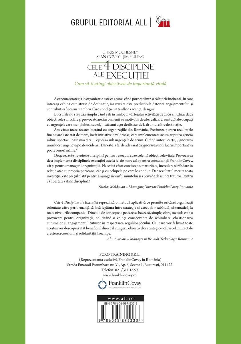 Cele 4 discipline ale execuției funcționează ca un ghid practic. Specialiștii din orice domeniu vor descoperi cum să stabilească și să măsoare obiectivele organizației pentru care lucrează folosind instrumente cu totul și cu totul noi. Iar cele mai îndrăznețe obiective se vor transforma astfel în realitate. Modelul propus este simplu, eficient și ușor de înțeles, dar mai ales ușor de aplicat. Pur și simplu, înglobează secretul dezvoltării și al succesului. Rezultă astfel o creștere a calității muncii și un grad mai mare de implicare al echipei. Cu adevărat incredibil este faptul că poate fi pus în practică și în ceea ce privește viața personală și familia. Așadar, după ce vei parcurge acest ghid, și munca, și viața ta vor deveni sursele de împlinire și fericire pe care ți le-ai dorit întotdeauna.