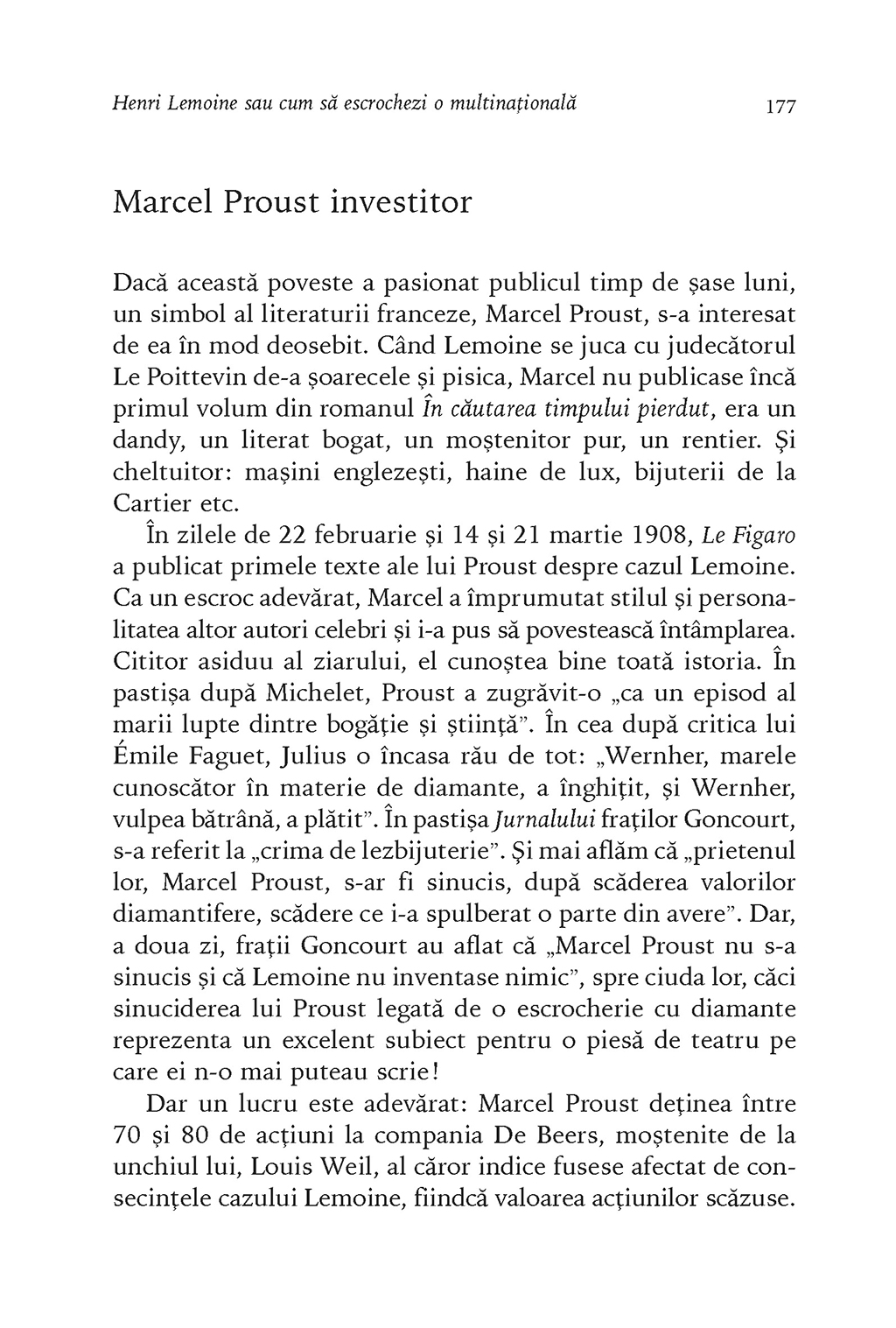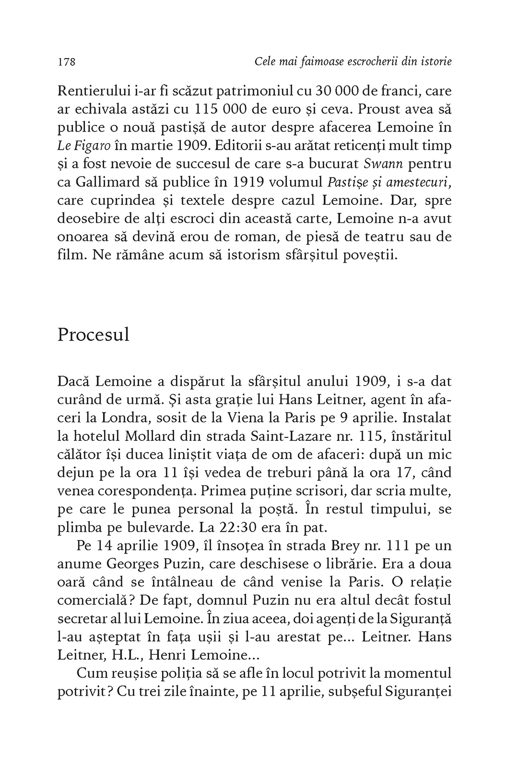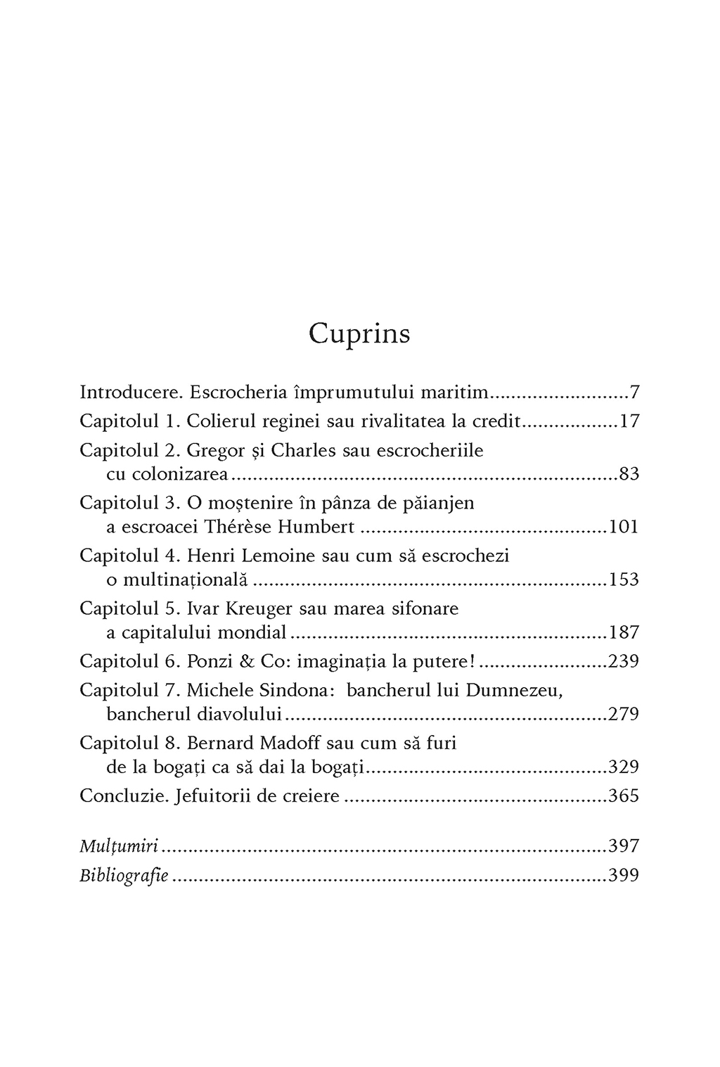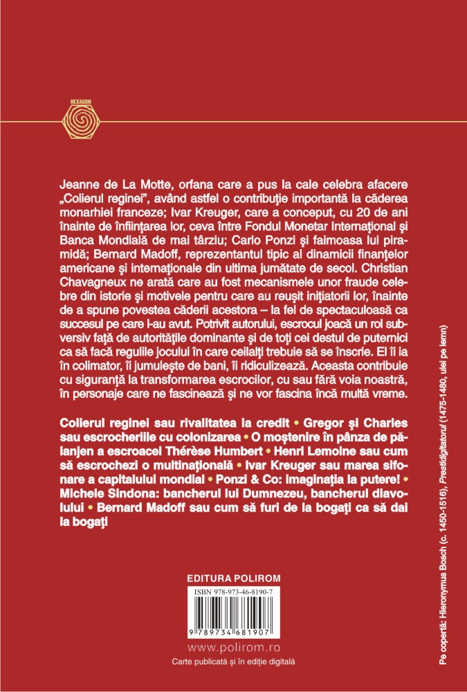 Jeanne de La Motte, orfana care a pus la cale celebra afacere „Colierul reginei”, avînd astfel o contribuție importantă la căderea monarhiei franceze; Ivar Kreuger, care a conceput, cu 20 de ani înainte de înființarea lor, ceva între Fondul Monetar Internațional și Banca Mondială de mai tîrziu; Carlo Ponzi și faimoasa lui piramidă; Bernard Madoff, reprezentantul tipic al dinamicii finanțelor americane și internaționale din ultima jumătate de secol. Christian Chavagneux ne arată care au fost mecanismele unor fraude celebre din istorie și motivele pentru care au reușit inițiatorii lor, înainte de a spune povestea căderii acestora – la fel de spectaculoasă ca succesul pe care l-au avut. Potrivit autorului, escrocul joacă un rol subversiv față de autoritățile dominante și de toți cei destul de puternici ca să facă regulile jocului în care ceilalți trebuie să se înscrie. El îi ia în colimator, îi jumulește de bani, îi ridiculizează. Aceasta contribuie cu siguranță la transformarea escrocilor, cu sau fără voia noastră, în personaje care ne fascinează și ne vor fascina încă multă vreme.