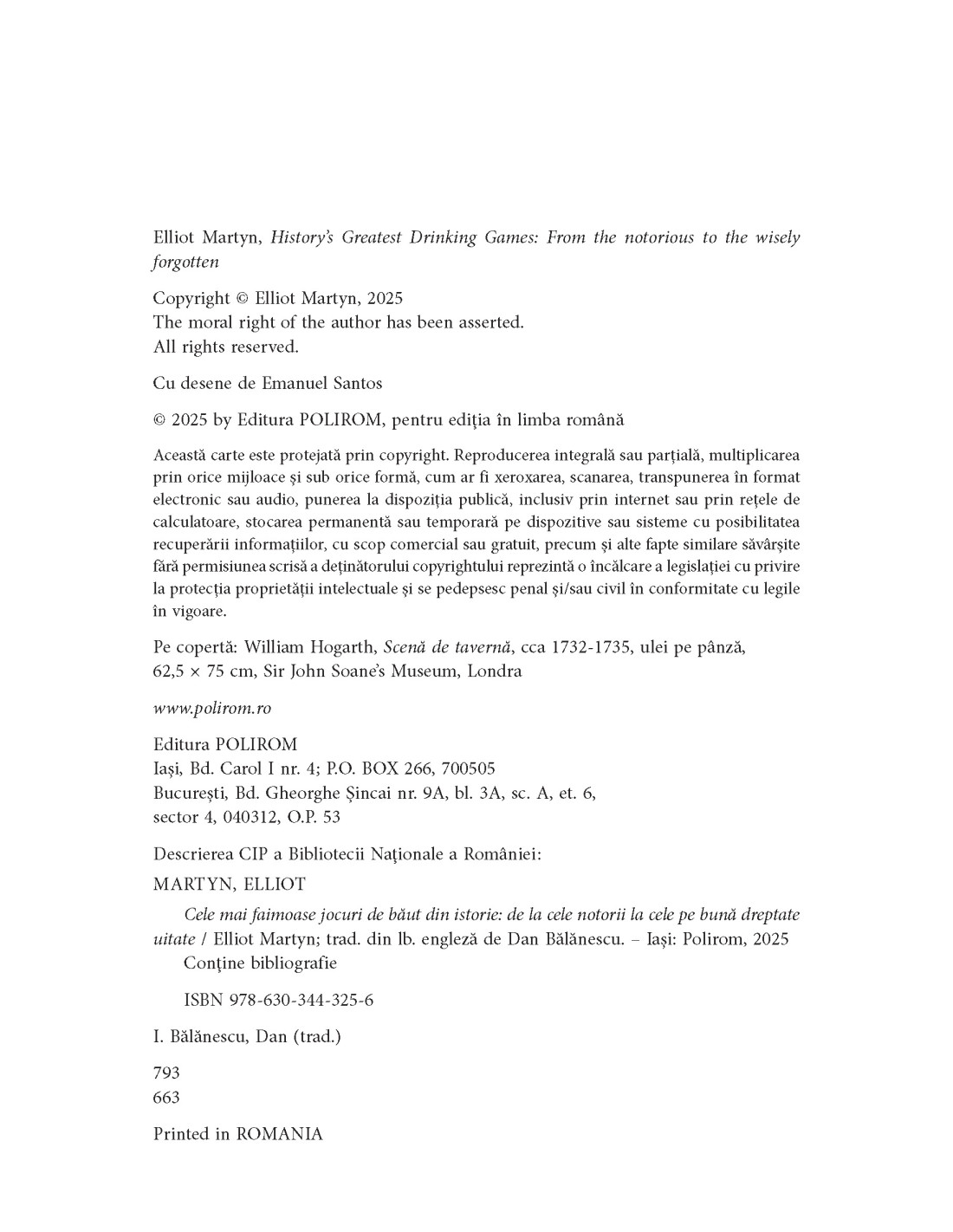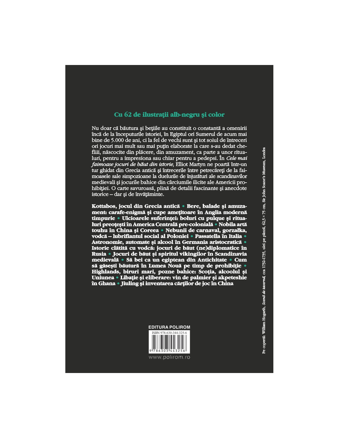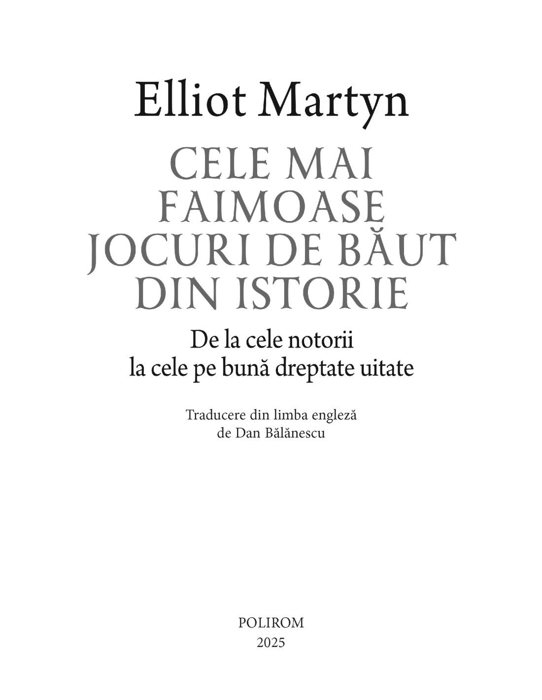 În Cele mai faimoase jocuri de băut din istorie, Elliot Martyn ne poartă într-un tur ghidat din Grecia antică și întrecerile între petrecăreți de la faimoasele sale simpozioane la duelurile de înjurături ale scandinavilor medievali și jocurile bahice din cârciumile ilicite ale Americii prohibiției. O carte savuroasă, plină de detalii fascinante și anecdote istorice — dar și de învățăminte.