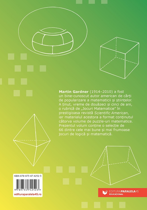 Martin Gardner (1914-2010) a fost un bine-cunoscut autor american de cărți de popularizare a matematicii și științelor. A ținut, vreme de douăzeci și cinci de ani, o rubrică de „Jocuri Matematice” în prestigioasa revistă Scientific American, iar materialul acestora a format conținutul câtorva volume de puzzle-uri matematice. Prezentul volum conține o selecție de 66 dintre cele mai bune și mai frumoase jocuri de logică și matematică.